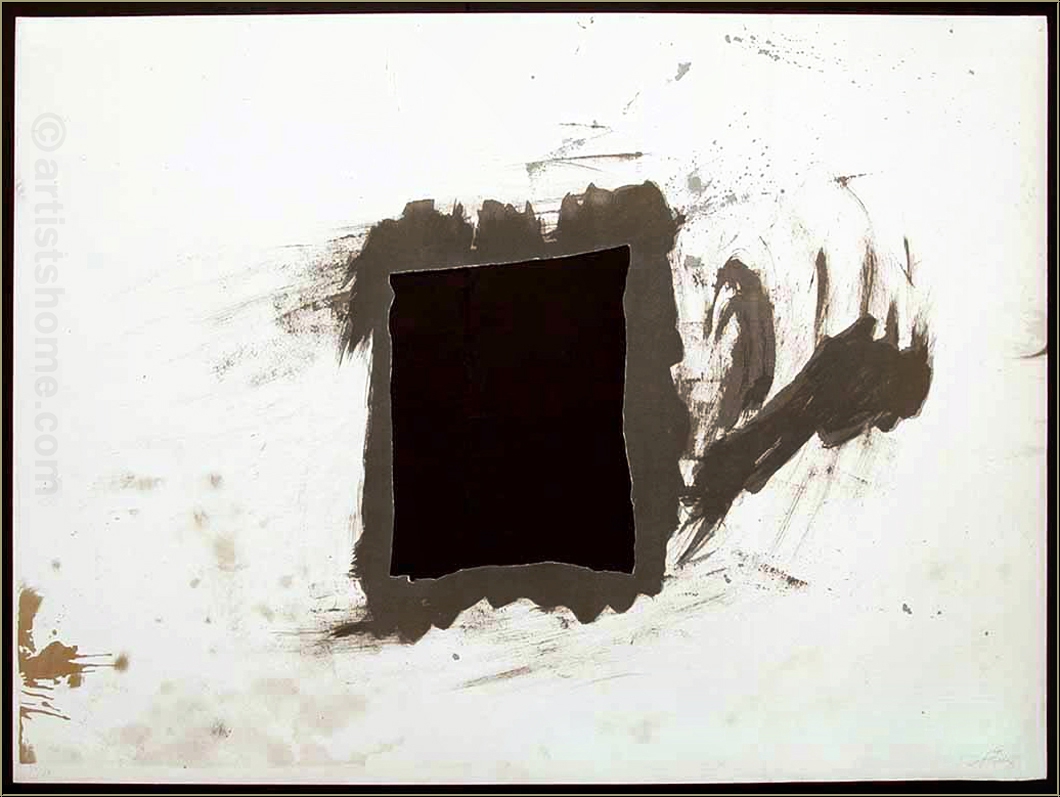 Early work in a small edition with the invitation to contribute: a rectangle with fringed edges has been punched out by Tàpies with the consequence that color and structure of the back panel chosen by its owner do directly interact with the artist's depiction (see photos).