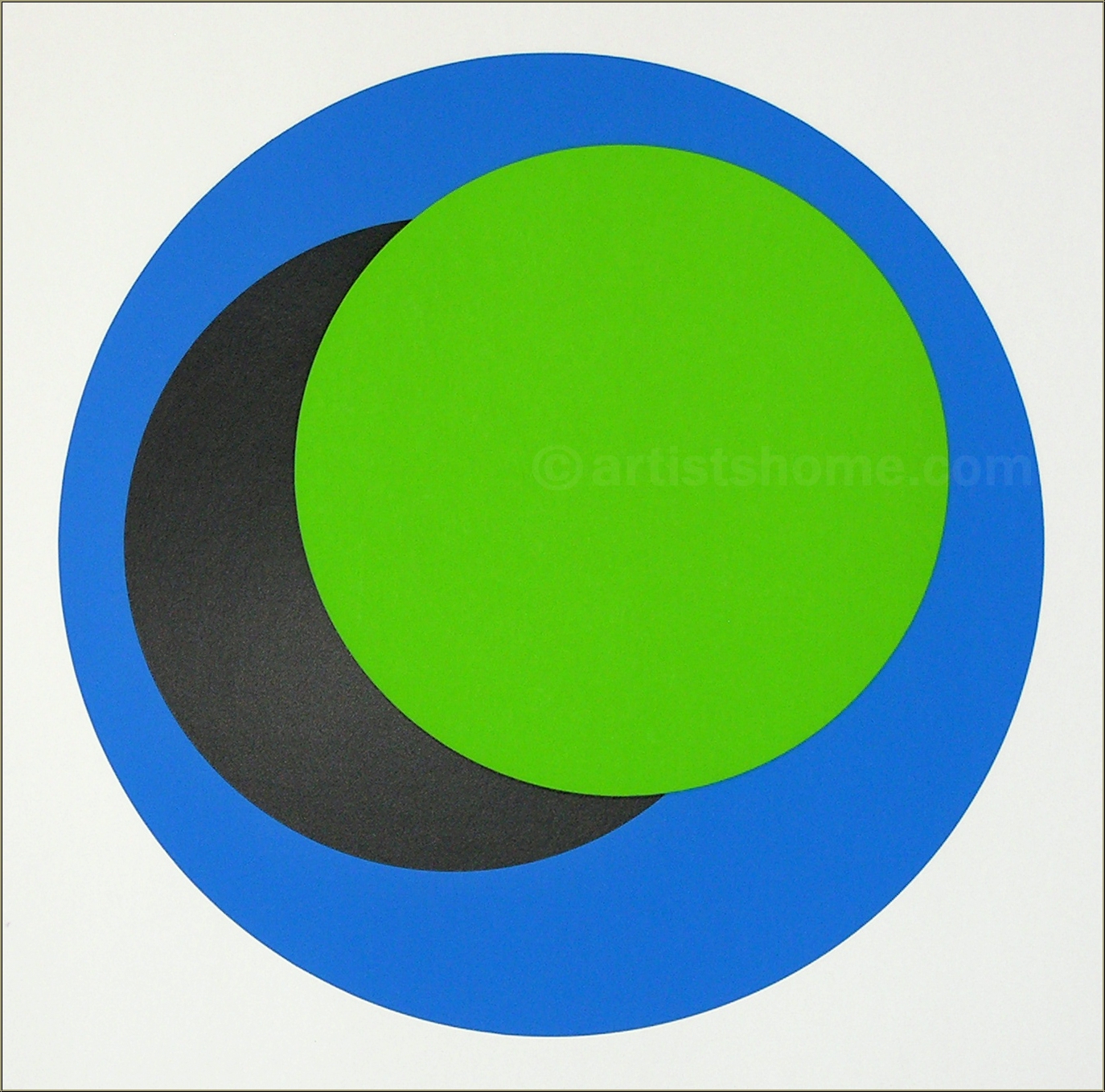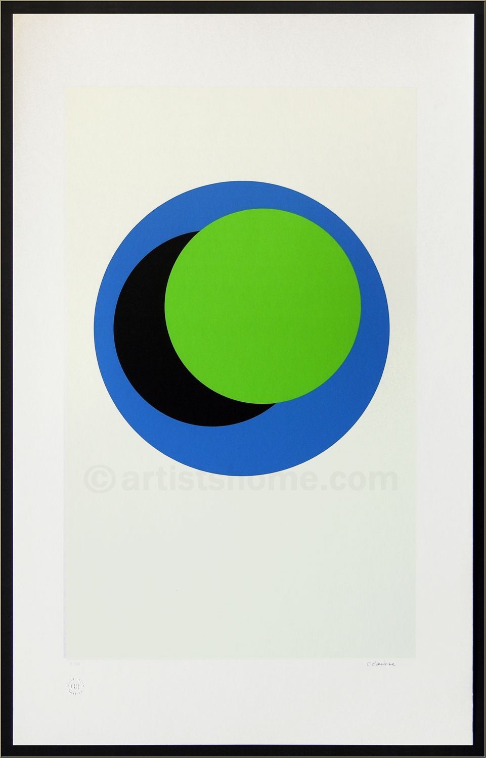 Geometric abstraction: Original serigraph with black, green and blue discs on white, signed by the French artist