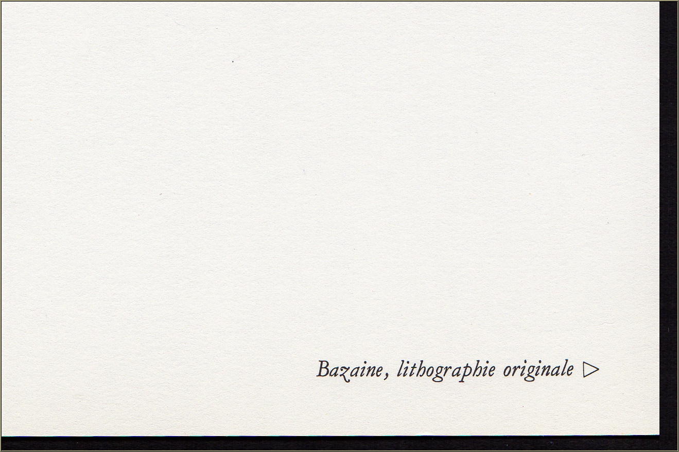 Text on the reverse, as published. The title "Bazaine, lithographie originale" is printed on the back of the previous lithograph but will be supplied as copy along with the lithograph.