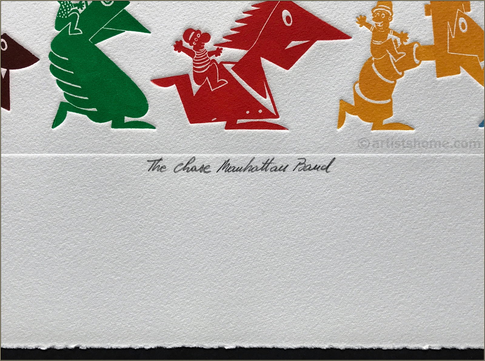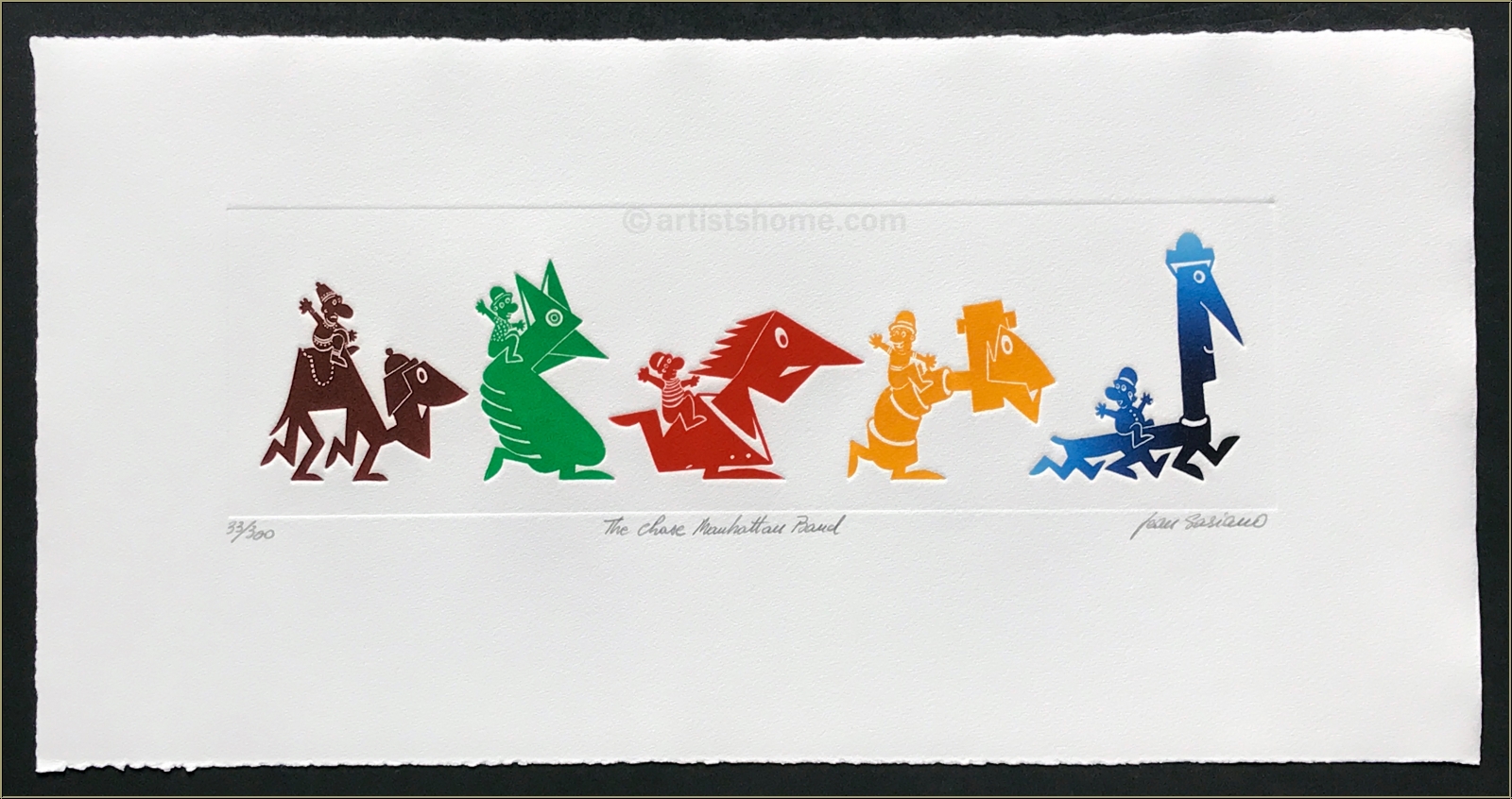 Colored embossed etching, created by Sariano on the theme of the "Chase Manhattan Bank", founded in the United States in 1955. By exchanging the last letter of "Bank", his five colorful "Band members" represent the exact opposite of a dreary and tedious bank.