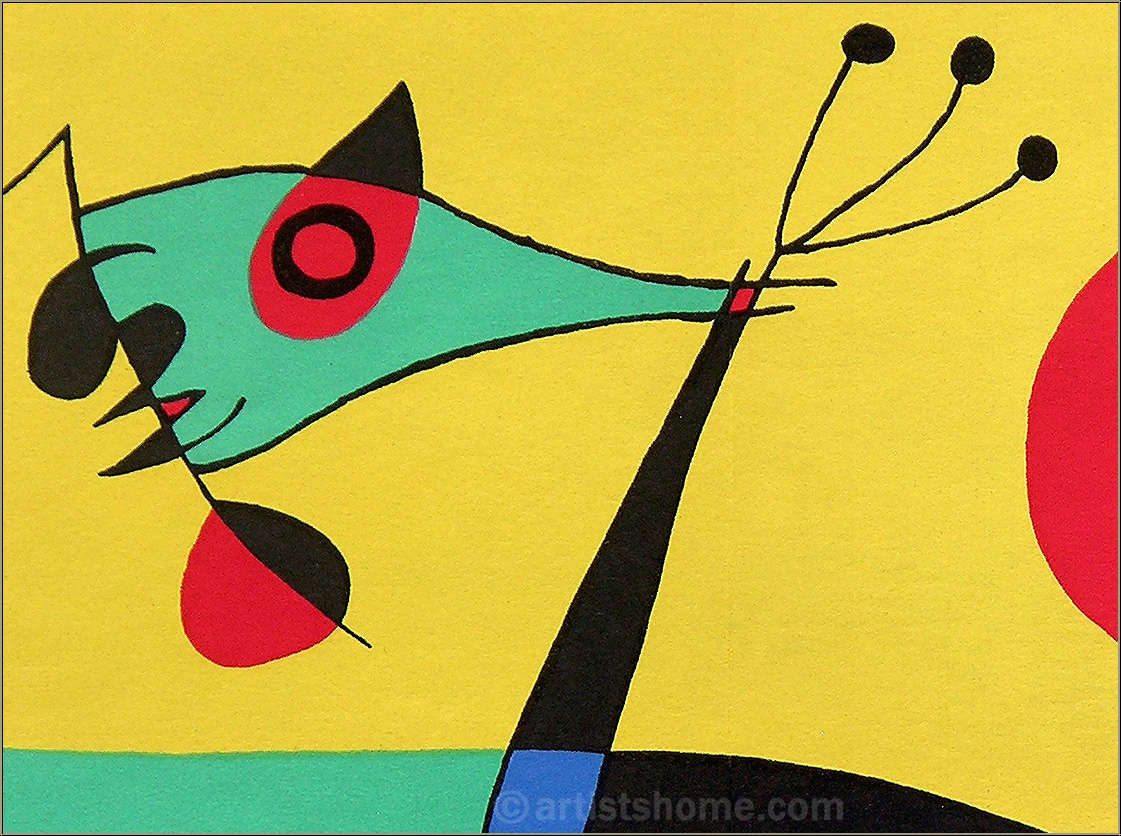 Details:Untitled (The Peacock Feathers) Joan Miró, who left many of his works untitled, also leaves it to the viewer’s imagination who is stealing whose magnificent feathers here - is it a little mouse or rather a bird that has sat down at the edge of a mirror? And is the owner of this feather really a peacock or - as the small red trunk on the left suggests - the pig in us adorning itself with borrowed plumes? The subject of this original print seems to be vanity, observed by a calm, red sun. Friends of the early, cubist Miró will appreciate this plastic-surreal work of his.