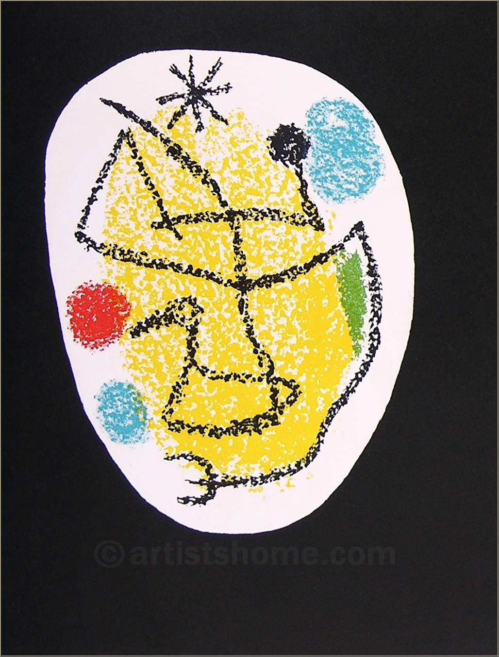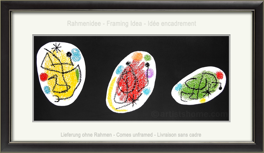 Original lithograph in colors with 3 drawings in white ovals on black background, large limted edition print