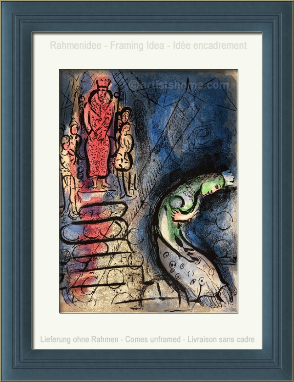 In 1956, the French art critic and publisher Tériade brought out a special issue of the legendary art magazine Verve, which was exclusively devoted to one of Marc Chagalls major themes: The Bible. For this outstanding issue, Chagall composed 18 full-page colour lithographs and 12 in black and white. For his "Bible I" Marc Chagall focused on characters from the Old Testament such as the Founding Fathers, the Kings, the Prophets and Angels. Four years later, in 1960, the follow-up issue "Illustrations for The Bible" was published, with another 24 gorgeous color lithographs. Since then, vast numbers of reproductions were put in circulation which are anything but original(!) lithographs.