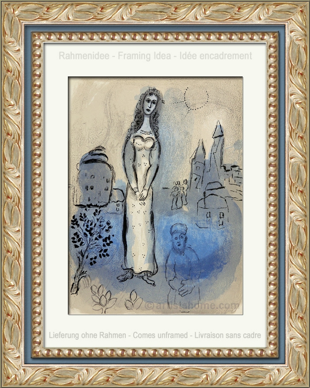 Details:"Esther" For this work, Chagall depicted Esther larger than life, gracefully and stunningly beautiful, in mellow tints of blue and beige. She almost seems to be floating. In this way, he pays tribute to one of the greatest women of the people of Israel. Thanks to her beauty and great personality, Esther became the queen at the court of the Persian King, Artaxerxes, after he had cast out his wife because of disobedience. Esther's uncle Mordechai, who also lived at the royal court, uncovered a conspiracy against the King and in doing so saved his life. But Haman, the highest court official, enviously hated all Jews. He obtained a writ from the King allowing him to extinct all Jews in the kingdom. Mordechai begged Esther to intercede with the King. She went to the King even though she was banned from doing so under threat of the death penalty. She successfully changed the King's mind, and this was how she saved her people from being wiped out. To this day, the Jewish holiday, Purim, reminds of Esther's great and couragous achievement. She risked her life for the Jewish people. In the lower part of the painting, we can also see Mordechai. He looks sorrow-stricken, his hands appear to be tied. His future seems grey and sullen, but there are signs of life and hope: the sun, plants and a tree.