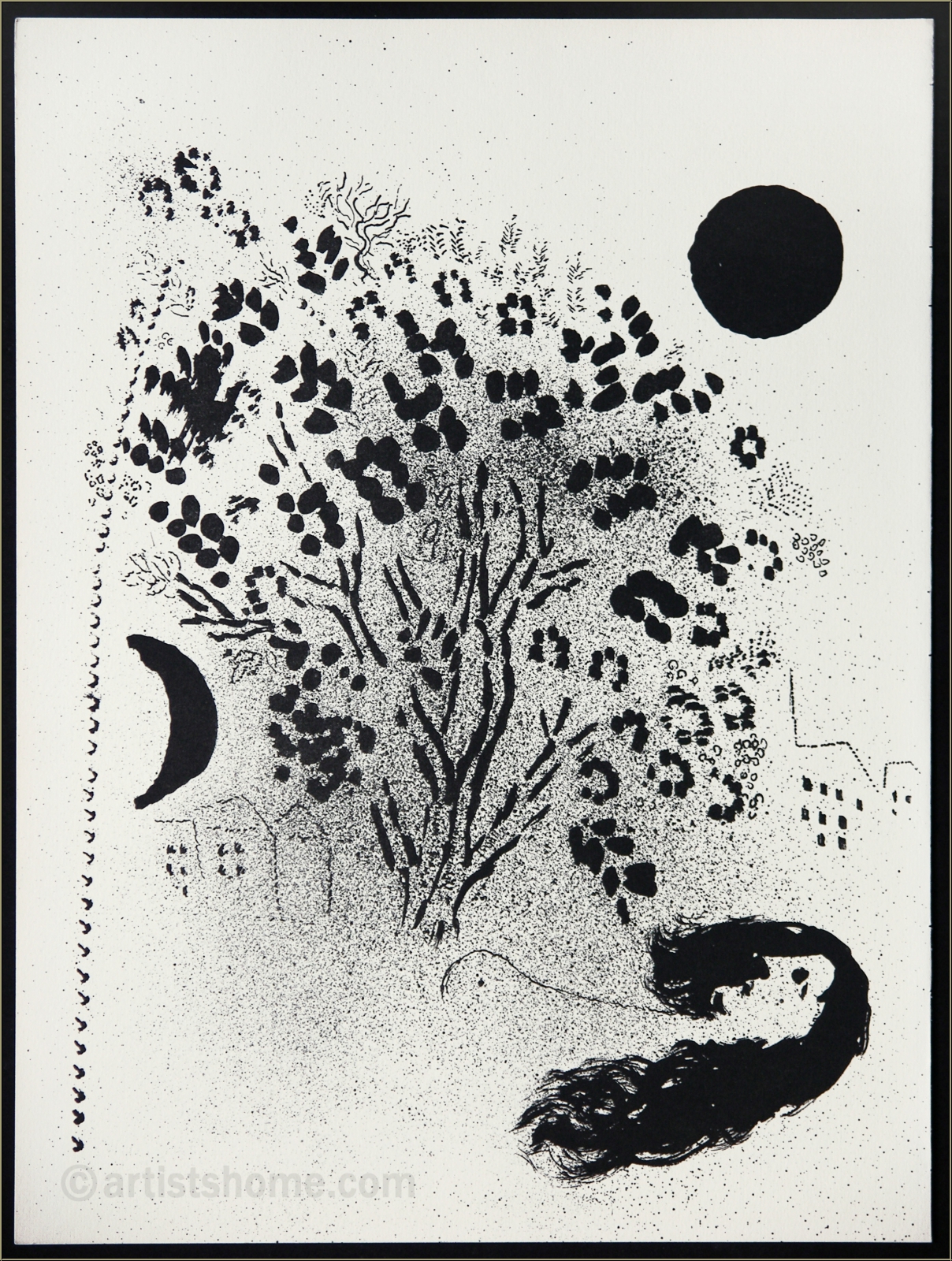 One of Chagall's earliest lithographs - a flowering tree with a woman lying under it, sun and moon, printed in black.