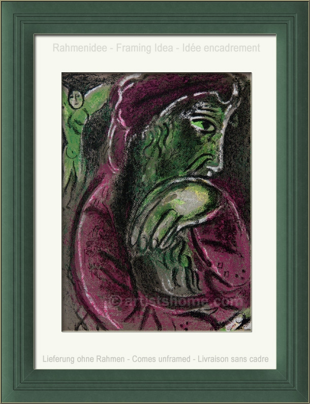 In 1956, the French art critic and publisher Tériade brought out a special issue of the legendary art magazine Verve, which was exclusively devoted to one of Marc Chagalls major themes: The Bible. For this outstanding issue, Chagall composed 18 full-page colour lithographs and 12 in black and white. For his "Bible I" Marc Chagall focused on characters from the Old Testament such as the Founding Fathers, the Kings, the Prophets and Angels. Four years later, in 1960, the follow-up issue "Illustrations for The Bible" was published, with another 24 gorgeous color lithographs. Since then, vast numbers of reproductions were put in circulation which are anything but original(!) lithographs.