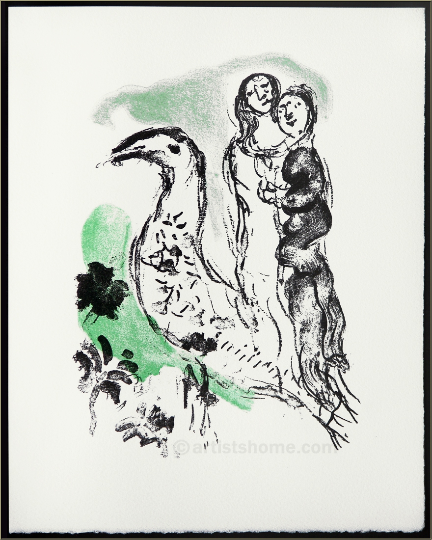 A couple that seems to be talking to an ibis passing through (often called a "holy ibis") is shown on this extraordinarily rare print by Chagall. According to the catalogue raisonné, the four lithographs, created by the artist about this subject in 1969, are his only works featuring the exotic animal. The captivating original colour lithograph was printed on laid paper by Arches as the frontispiece for the volume by L.S. Senghor, mentioned above.