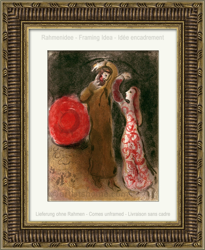 Details:"Meeting of Ruth and Boaz" In this picture, Chagall shares with us the moment when Ruth and Boaz first meet. It seems as though they are wildly gesturing. However, when looking more closely at their faces, you will find that they are not arguing, on the contrary, according to the language of the Bible the gesture of the two lovers holding their left arms up in the air to the right over their heads almost making semi-circles suggests a good-hearted and truthful intention. Most likely, Chagall intended to stress Boaz’ friendliness and generosity, with which he receives the foreign woman after he had heard about her diligence when collecting ears of grain (Ruth 2,4 ff). The warm shades of brown and red he used in this painting radiate harmony and a feeling of security and already reveal what is going to happen next. Marc Chagall dedicated a sequence of five lithographs to the chapter of Ruth. This one is the third on the woman who became Boaz’ wife and consequently King David’s primordial mother through love, faithfulness and consistency.