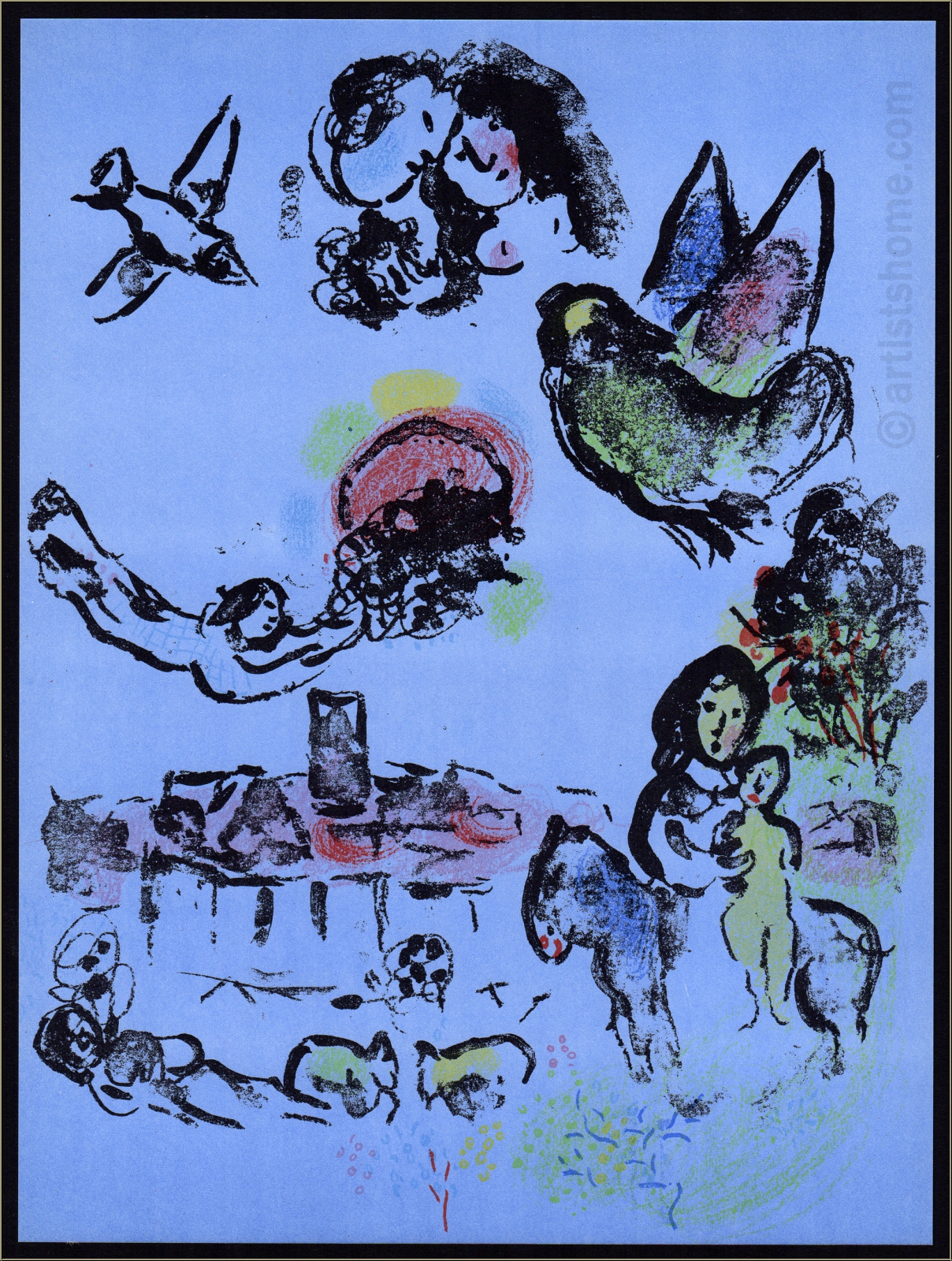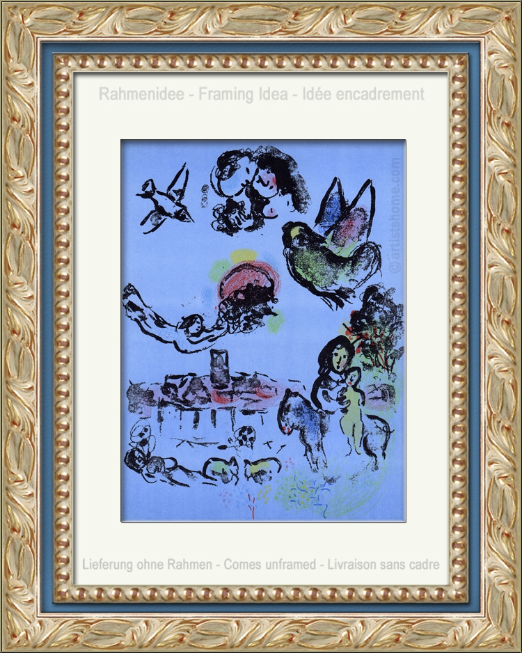 | | "Nocturne at Vence" (Mourlot 400) | Technique: | Original lithograph in colors "Nocturne à Vence" (Mourlot No. 400) This is N O T a mass-produced photomechanical reprint but the original lithograph from the year 1963, exactly as referenced in Mourlots catalogue raisonné. | | Year: | 1963 | | Edition/Paper: | Offered here is one of the unsigned impressions for the limited book edition on smooth velin paper. In addition, 150 impressions on Arches wove paper with full margins were pulled and signed by the artist | | signed: | unsigned, as issued. | | Published by: | Éditions André Sauret, Monte-Carlo | | Printed by: | Mourlot, Paris | | Remarks: | Between 1960 and 1974 Marc Chagall created 28 full-page lithographs for the six authoritative volumes about his entire lithographic work. These original lithographs are not to be confused with photomechanically reproduced prints with the same motif. | Documentation/ References: | Mourlot, Fernand. Chagall Lithograph [III] 1962-1968, André Sauret, Monte Carlo, 1969, No. 400 Your print is being delivered with an abstract from the a.m. catalogue raisonné. In addition, you'll receive a proof of identity (without selling price in case this print is intended as a present). | | Condition: | Read more A well-preserved impression from the archives. Frame not included in delivery. | | | Customer Reviews: This item has not been rated, yet. Customer ratings may only be submitted by customers who have bought this item and are logged in. Your name will, of course, be displayed anonymized (e.g., "Tom H., United Kingdom").  *Applies to deliveries to Germany paid via PayPal. In case of payment by bank transfer, delivery will take 1-3 days longer from the day of your banker�s order. Delivery times for other countries and information for estimating the day of delivery can be found here |