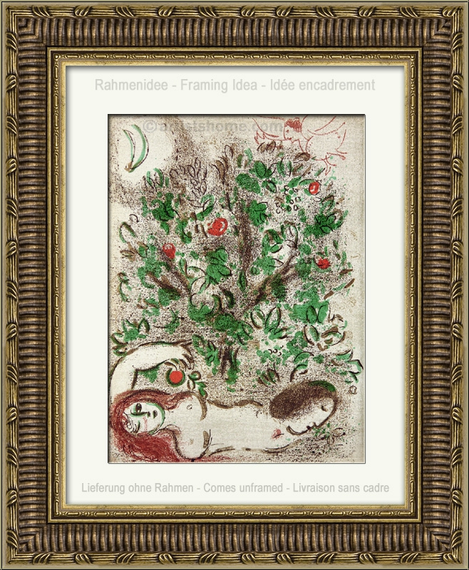 In this lithograph, Chagall depicted the biblical theme of the fall of man. Adam and Eve are resting under the tree of knowledge of good and evil. They are "one flesh" (Genesis 2,24), that is they became one. This implies that they belong together. In Hebrew, they are called "Adam and Adamah": Man and woman, on a par with each other.