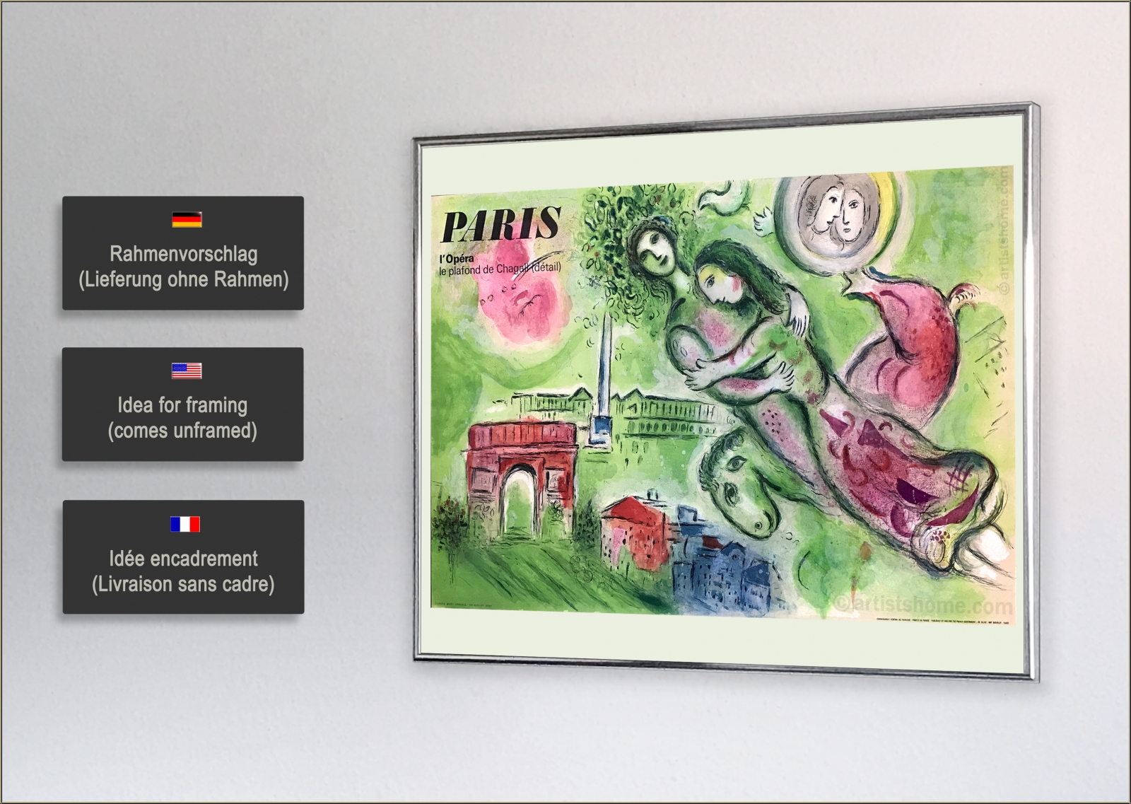 Original poster ("Roméo et Juliette") published by and for the French Government to promote the Paris Opera as well as other Parisian sights such as the Place de la Concorde and the Arc de Triomphe. Executed by Charles Sorlier, senior lithographer at the Mourlot studios in Paris, after a detail of Chagall's Ceiling of the Opera.