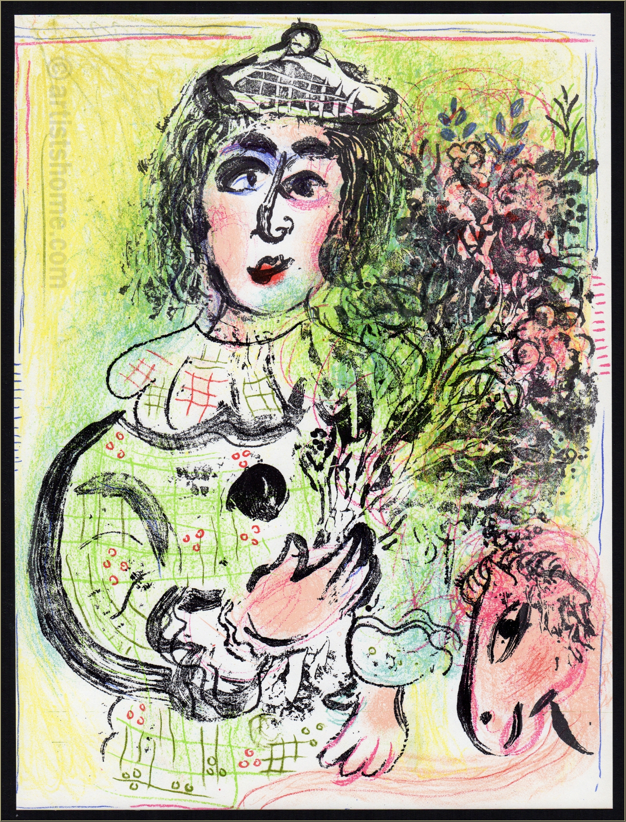| | A clown in love with a huge bunch of flowers, original lithograph in tender pastel colors (Mourlot no. 399) Item No.: CHA-63-06 Delivery: Price: £ 258.08 Prepayment price: £ 245.18 subject to the margin scheme (§25a UStG) Buy with complete confidence: For details please click  In-Stock-Guarantee: we do not list sold-out or currently unavailable items  5% discount for advance payment by bank transfer  We do not sell reprints made at a later date but original prints  We ship insured and at fair prices within 24h, trackable online |