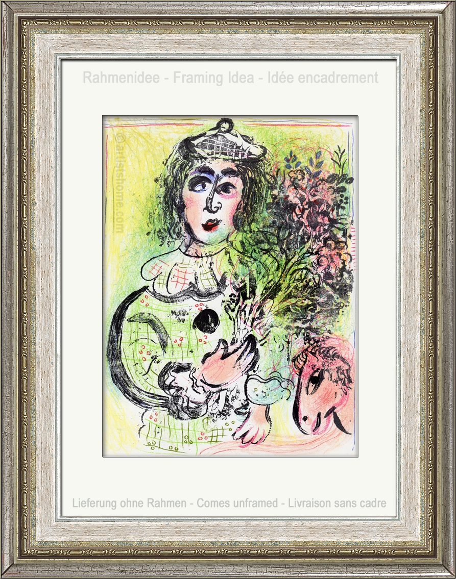 | | "The clown with flowers" (Mourlot 399) | Technique: | Original lithograph in colors "Le Clown fleuri" (Mourlot No 399) This is N O T a mass-produced photomechanical reprint but the original lithograph from the year 1963, exactly as referenced in Mourlots catalogue raisonné. | | Year: | 1963 | | Edition/Paper: | Offered here is one of the unsigned impressions for the limited book edition on smooth velin paper. In addition, 150 impressions on Arches wove paper with full margins were pulled and signed by the artist | | signed: | unsigned, as issued. | | Published by: | Éditions André Sauret, Monte-Carlo | | Printed by: | Mourlot, Paris | | Remarks: | Between 1960 and 1974 Marc Chagall created 28 full-page lithographs for the six authoritative volumes about his entire lithographic work. These original lithographs are not to be confused with photomechanically reproduced prints with the same motif. | Documentation/ References: | Mourlot, Fernand. Chagall Lithograph [III] 1962-1968, André Sauret, Monte Carlo, 1969, No. 399 Your print is being delivered with an abstract from the a.m. catalogue raisonné. In addition, you'll receive a proof of identity (without selling price in case this print is intended as a present). | | Condition: | Read more A well-preserved impression from the archives. Frame not included in delivery. | | | Customer Reviews: This item has not been rated, yet. Customer ratings may only be submitted by customers who have bought this item and are logged in. Your name will, of course, be displayed anonymized (e.g., "Tom H., United Kingdom").  *Applies to deliveries to Germany paid via PayPal. In case of payment by bank transfer, delivery will take 1-3 days longer from the day of your banker�s order. Delivery times for other countries and information for estimating the day of delivery can be found here |