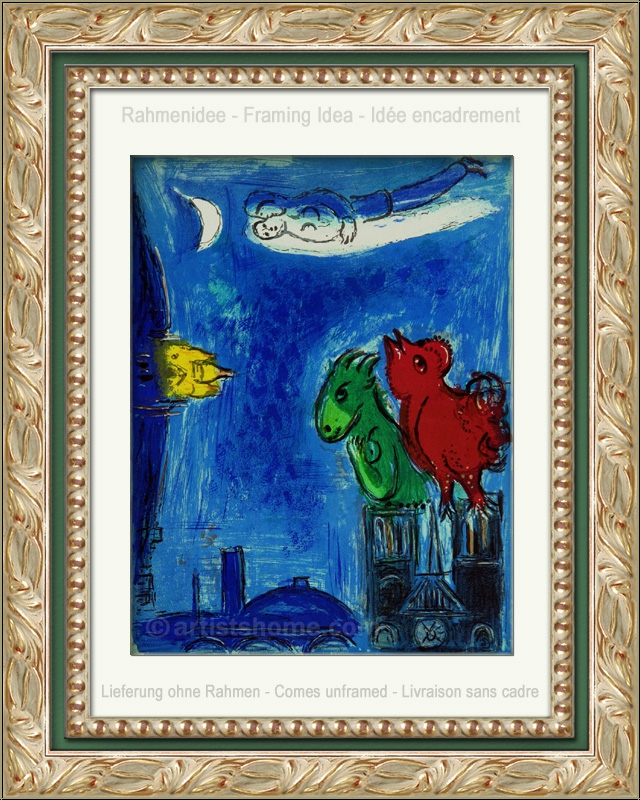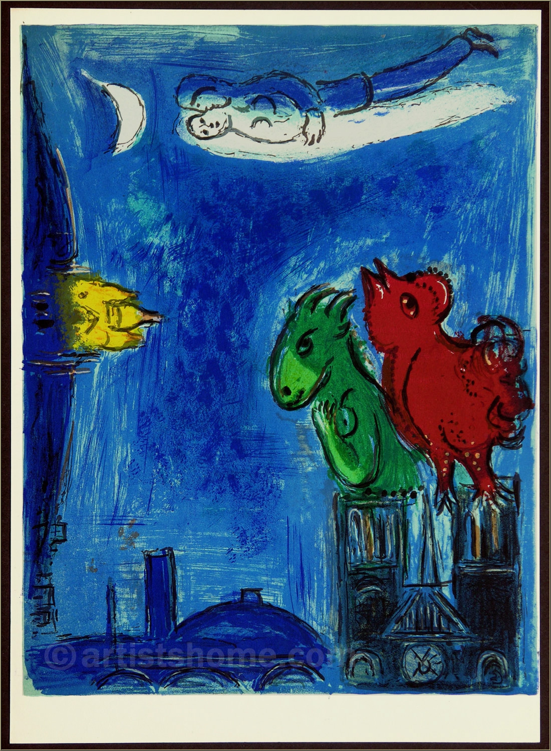 Just as the hunchback of Notre Dame was not a monster, Chagall's animals were never monsters, either. Chagall must have named this lithograph with a smile on his face. Even though his little 'monsters' appear over-sized on top of the Notre Dame cathedral, the cock in the picture looks rather longingly to the lovers floating above it, while the female donkey seems to struggle having to decide between Sacre Coeur and the pantheon. It is a peaceful scene of the Paris twilight, and a splendid graphic to the story of the hunchback of Notre Dame and Esmeralda. The composition and choice of colours are typical for Chagall's art.