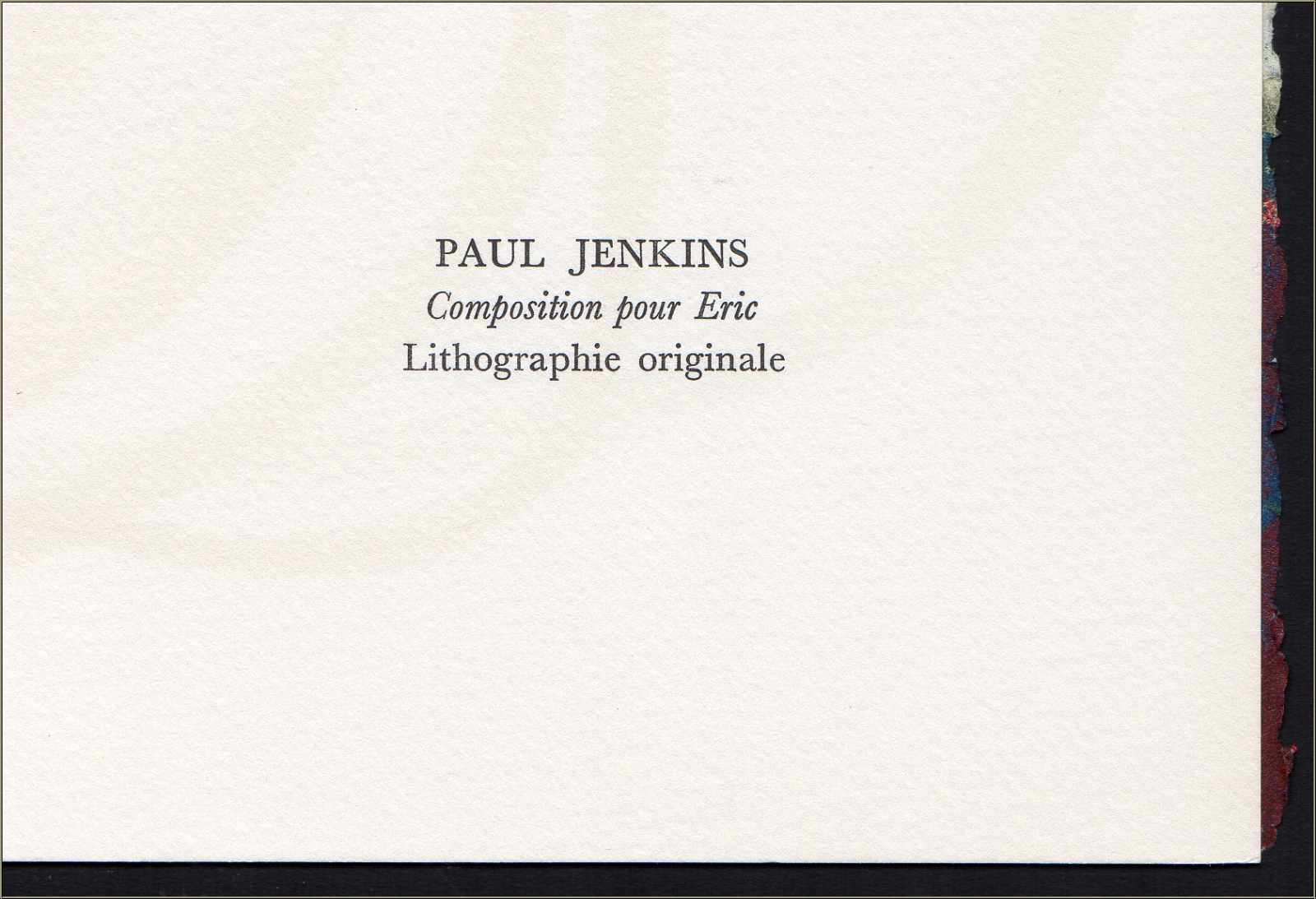 Edition | Paper: One of 800 unsigned impressions on Arches wove paper. Text on the reverse: "Paul Jenkins - Composition pour Eric - Lithographie originale"