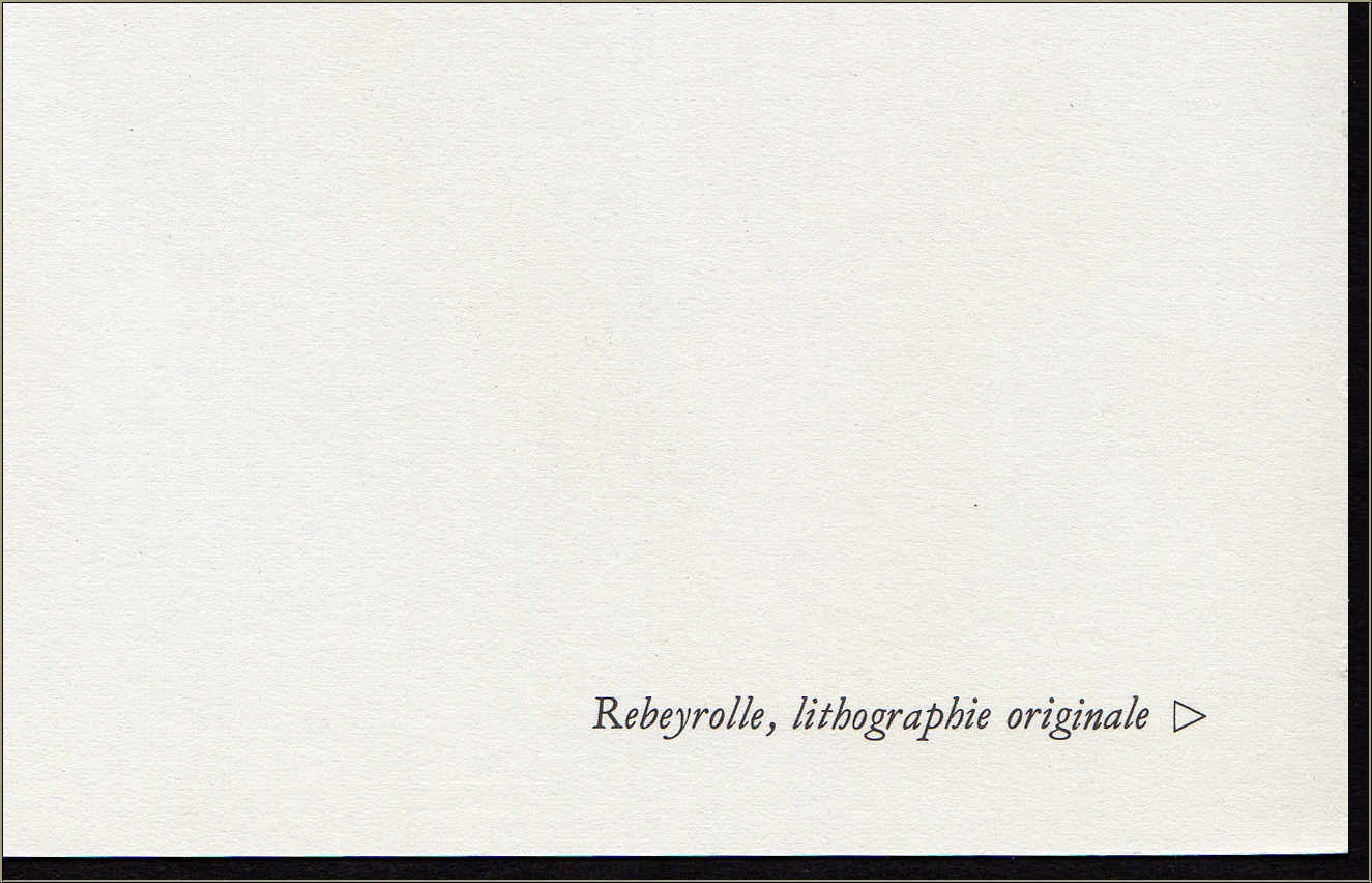 Text on the reverse, as published. The title "Rebeyrolle, lithographie originale" is printed on the back of the previous lithograph but will be supplied as copy along with the lithograph.