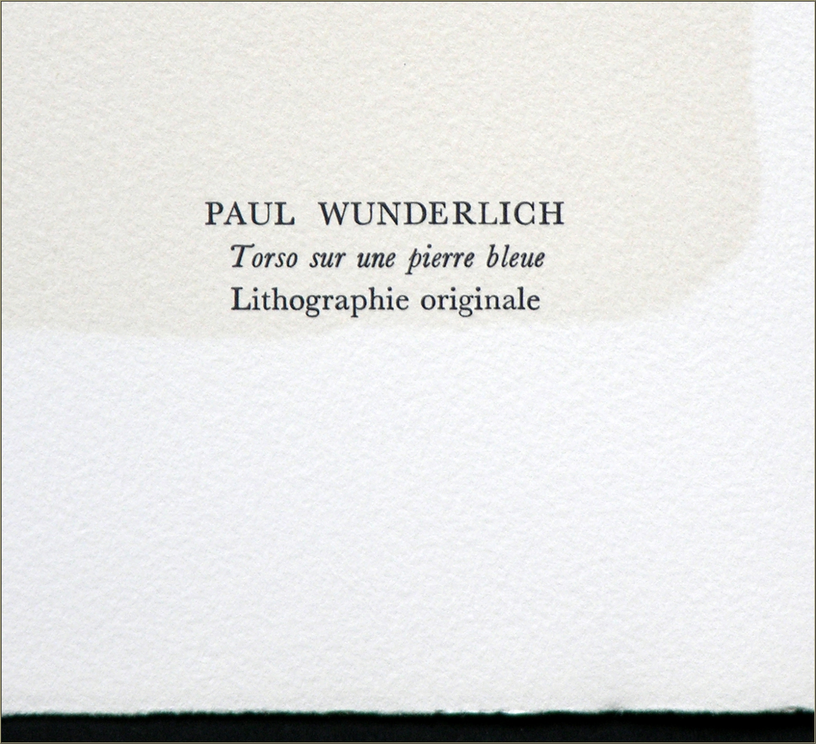 | | | | Torso sur une pierre bleue (Official title: "Kleine Familie / Small Family") Original lithograph by Paul Wunderlich for Fernand Mourlots renowned portfolio "Souvenirs et portraits d'artistes". This is N O T a mass-produced mere art print (e.g. offset or grano lithograph from a later "Limited edition") but the original lithograph from the collector's de luxe edition of the a.m. portfolio, exactly as referenced in the official catalogue raisonné. WARNING: There are currently very similar-looking prints sold on the internet, at small prices. These are unauthorized reprints (pirated copies) an NO original lithographs! | Edition: | One of 800 unsigned impressions on Arches laid paper for the "de luxe" edition, as published in 1972 | | Size: | 32,5 x 25 cm (sheet size), 22,5 x 19 cm (image size) | | Published by: | Alain C. Mazo, Paris and Léon Amiel, New York, 1972 | | Printed by: | Mourlot, Paris | | Remarks: | Text on the reverse: "Paul Wunderlich - Torso sur une pierre bleue - Lithographie originale". Title of this lithograph in the official catalogue raisonné of Wunderlich's graphic work (see below) is "Kleine Familie" ("Small family") | Documentation/ References: | Riediger, Carsten. Paul Wunderlich. Werkverzeichnis der Druckgraphik 1948-1982 [III], Edition Volker Huber, Offenbach, 1983, p. 268-269, No. 442. See also at https://mourlot.com: "Livres de Fernand Mourlot" Your print is being delivered with an abstract from the a.m. catalogue raisonné (in German). In addition, you'll receive a proof of identity (without selling price) in case this print is intended as a present. | | Condition: | Read more A flawless impression from the archives! Comes unframed. | | | | Customer Reviews: This item has not been rated, yet. Customer ratings may only be submitted by customers who have bought this item and are logged in. Your name will, of course, be displayed anonymized (e.g., "Tom H., United Kingdom").  *Applies to deliveries to Germany paid via PayPal. In case of payment by bank transfer, delivery will take 1-3 days longer from the day of your banker�s order. Delivery times for other countries and information for estimating the day of delivery can be found here |