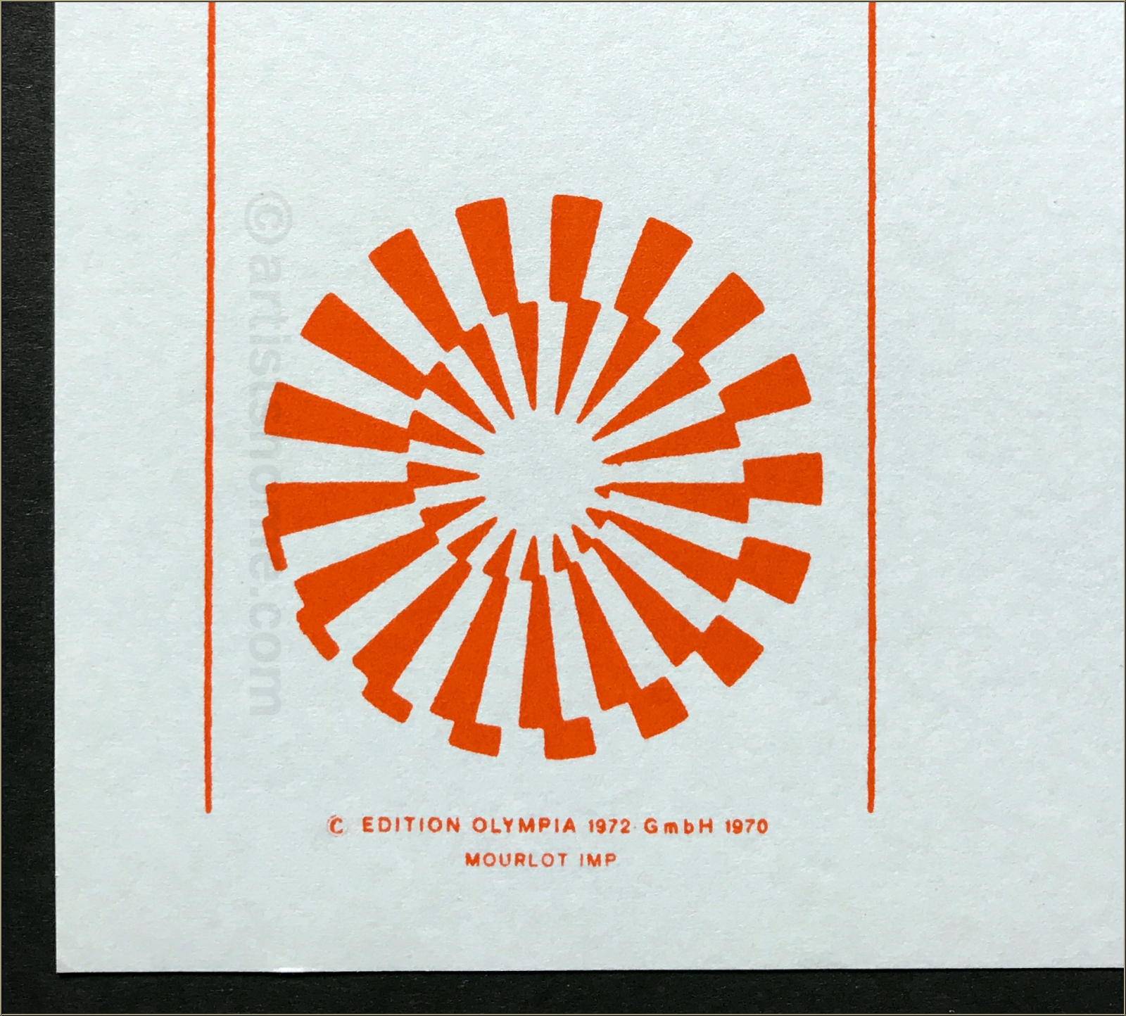 Original poster for the 1972 "Edition Olympia" featuring the original lithograph No. 29, identifiable by Mourlot's imprint right below the publisher's imprint. Posters with different imprints, e.g. "Printed in Germany" or "Printed in Germany for Kennedy Graphics, Inc." are offset reproductions of the original poster and NO original lithographs!