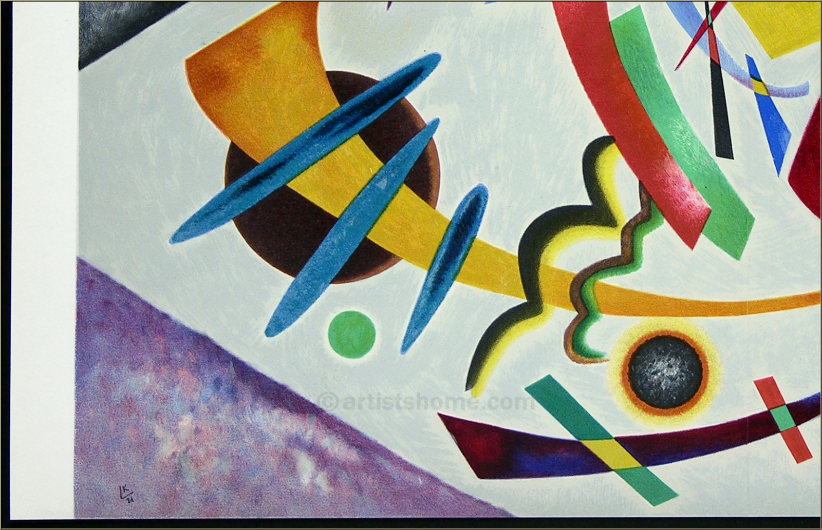 Details:"Tache rouge II" (Red Spot II) - 1921 / 1960 The picture that served as a basis for this color lithograph came from a series of 8 works that Kandinsky completed in 1921, just before he deliberately went into exile from Russia (the then new Soviet Union) to Berlin with his wife Nina. Because the eye of the beholder is automatically directed toward the white lively area, the four triangles on the corners are perceived later on with a slight delay. Kandinsky also used those triangles in his paintings to mark out the area of focus. This central area, whose Kandinsky’s biographer Will Grohmann called the “stage of the pictorial process”, is an octagonal brittle form, almost hard with a “cool tension” to it. Nevertheless, Grohmann considered all eight pictures of this year as “of the highest perfection”.