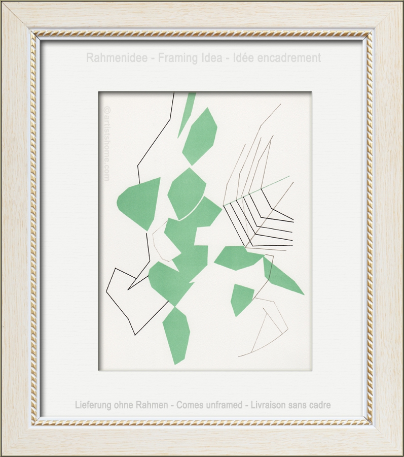 Abstract design with light green leaves and spider web on strong wove paper, printed in France