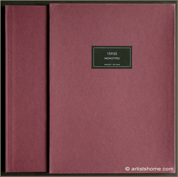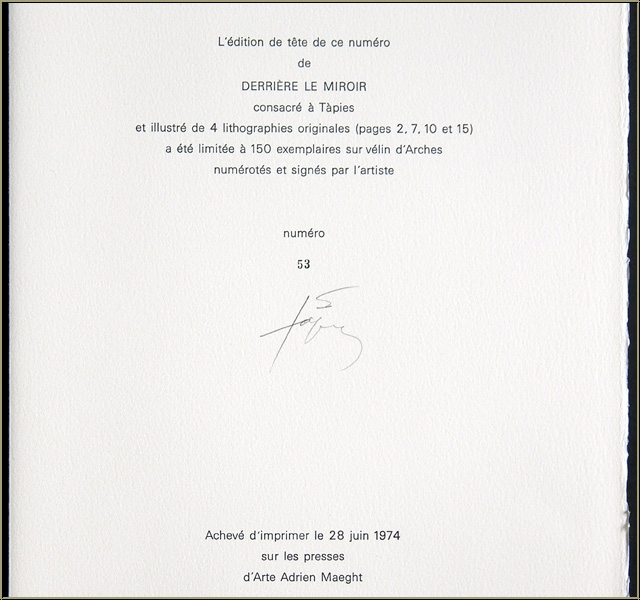 | | | Derriere le miroir No. 210 - "DE LUXE", 1974 "Tapies - Monotypes" - Signed collector's copy on Arches wove paper. | | About Derrière le miroir: | In the postwar year 1946, Aimé and Marguerite Maeght, owners of the Galerie Maeght in Paris, embarked on a publishing venture: in search of a kind of "forum" for the discussion and distribution of original graphic work by "their" artists, the idea of Derriere le miroir was born. More... | | Details on this DE LUXE issue: | The DLM issue no. 210 was published on the occasion of an exhibition at the Maeght gallery in June 1974 in Paris, where 36 monotypes were shown. It contains 2 large original lithographs by Antoni Tapies as well as additional 4 lithographs after Tàpies. This is one of only 150 signed and numbered copies from the "Deluxe" edition on Arches wove paper. Note: The editor indicates in the imprint 4 original lithographs instead of 2, as stated in the relevant catalogue raisonné (Galfetti, see below). 32 pages, all on Arches wove paper. In the original aubergine-colored slipcase (39 x 29 cm). Pencil signed by Tapies and numbered on the colophon. With 2 original lithographs as double pages: "Lithograhie monochrome", Galfetti No. 408 "Lithograhie monochrome", Galfetti No. 409 plus 4 large lithographs in dark brown after Tàpies, all on Arches wove. Sheet size: 38 x 56 cm (double pages with centrefold) Copy size: 38 x 28 cm Published by: Maeght Editeurs, Paris Printed by: Arte Adrien Maeght, Paris Texts: Georges Raillard Original collector's "de luxe" edition. | | Catalogue raisonné / Reference: | | Galfetti, Mariuccia: Tàpies. Das graphische Werk | L'oeuvre gravé 1973-1978, Erker-Verlag St. Gallen, 1984, p. 65-67, Nos. 408-409 This copy is being delivered with an abstract from the a.m. catalogue of works. | | Condition: | [X] Complete Read more Condition report: Aubergine-colored original slipcase: slightly shop-soiled; Interior portfolio: fine, flawless. Overall condition: very good, a well-preserved copy! | Customer Reviews: This item has not been rated, yet. Customer ratings may only be submitted by customers who have bought this item and are logged in. Your name will, of course, be displayed anonymized (e.g., "Tom H., United Kingdom").  *Applies to deliveries to Germany paid via PayPal. In case of payment by bank transfer, delivery will take 1-3 days longer from the day of your banker�s order. Delivery times for other countries and information for estimating the day of delivery can be found here |