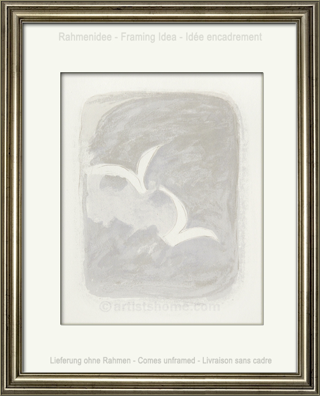 Details:Color lithograph for "Descente aux enfers" (Descent into hell) As the opening motif for Marcel Jouhandeau’s "Descent to Hell", Georges Braque created a very light work consisting of three different shades of grey. A flying bird couple that seems to emerge from far-off mists … Happy to be seeing what is beneath them again. The work seems tender and delicate, and its "colourlessness" makes it seem even more expressive. This is the first of four original colour lithographs that Braque used to illustrate one of his last artists’ books (see title above). All four show flying birds - a subject that became so important to him towards the end of his life that he reinvented it in countless variations.