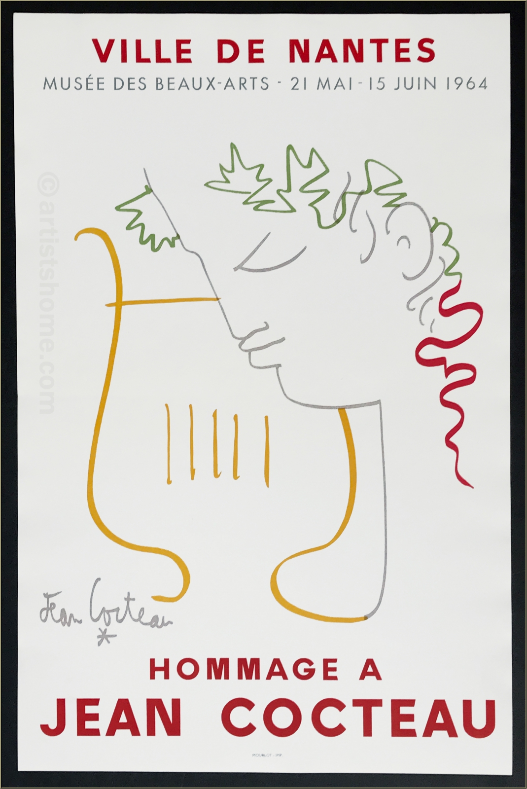Details:Hommage à Jean Cocteau, Ville de Nantes, 1964 Original lithograph poster featuring "Orpheus with lyre", executed by Mourlot to accompany a commemorative exhibition after the death of the artist, organized by the Musée des Beaux-Arts in Nantes, France.