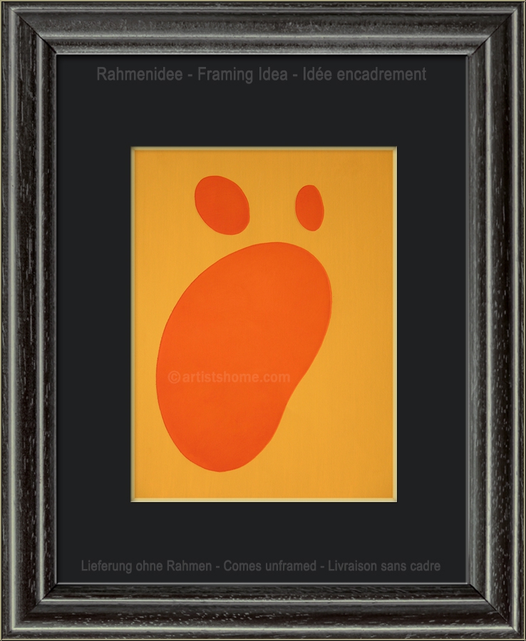 A dynamic energy is generated by the play of a subtle color relationship: a three-part orange form with a slight relief on yellow background.