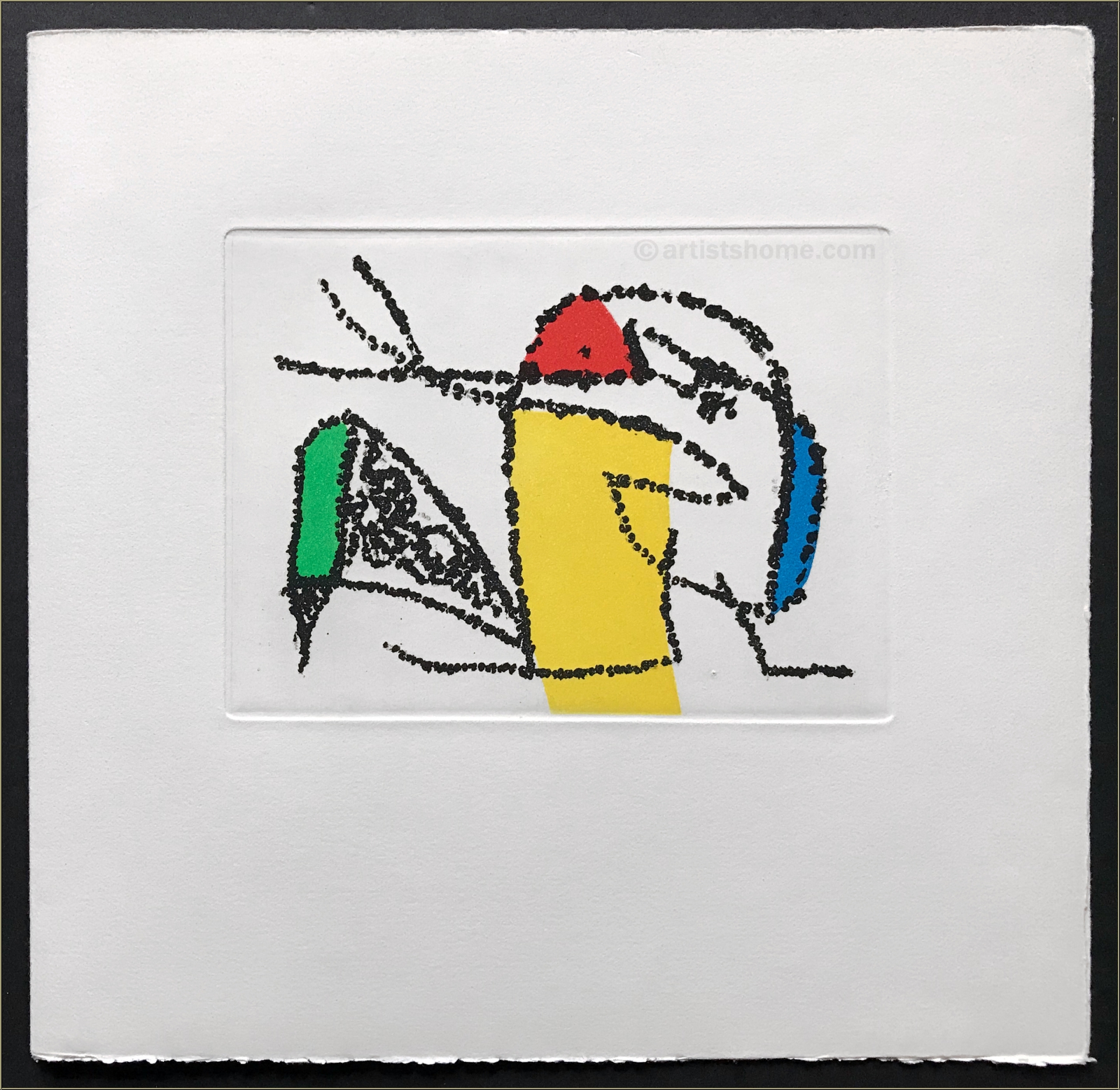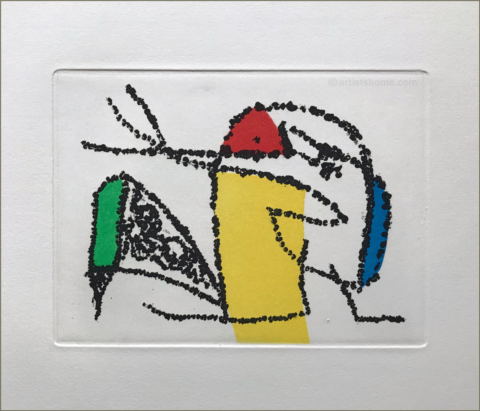 By Joan Miro affectionately illustrated artist's book, the full sheets printed on Arches, loose in a yellow linen-covered box. With 2 (of originally 3 including one for the cover) original etchings with aquatint in colors by Joan Miro. Signed in pencil by the author André Frénaud and numbered on the justification. Text in French, illustrated with 4 vignettes by Miro.