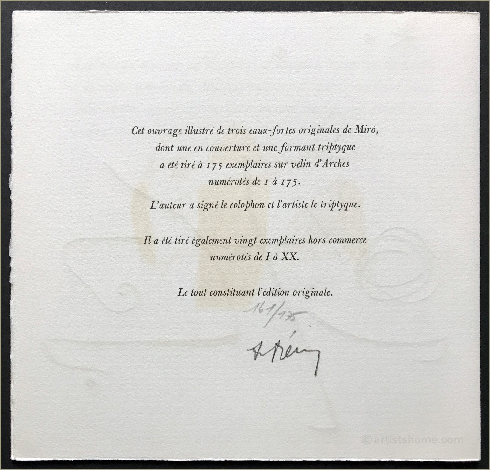 Starting in 1946, the editor Maeght in Paris has published some of the most beautiful illustrated artist's books in small limited editions, called "Grandes éditiones originales illustrées". From time to time one of them can be seen during art auctions of renowned auction houses. The complete box with 3 etchings was sold last in 2000 at Christie's in New York for $5,000. The signed etching is missing here, otherwise complete (28 pages, all on Arches, with 4 little vignettes within the French text by Miro).