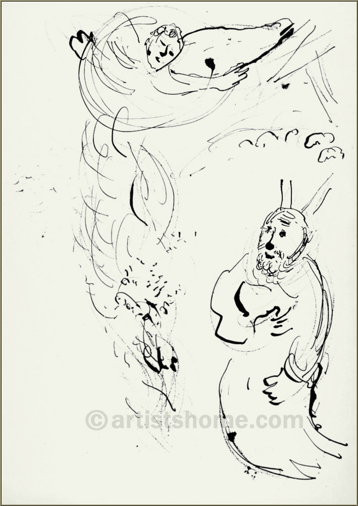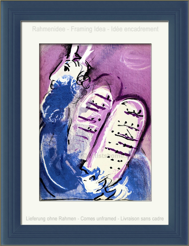 Details:"Moses III" Moses is one of the most important personalities in the history of the Jewish people. Chagall dealt with the story of Moses several times and the prophet inspired many of his artworks. Commissioned by God, Moses had the difficult task of leading the people of Israel out of slavery in Egypt to freedom. In the Sinai desert, he eventually received the Ten Commandments from God. In the Jewish tradition, the Ten Commandment are considered directives. “If you love God, you will not steal, lie or commit adultery”. In this third theme of his graphics on Moses, Chagall depicts the prophet as he turns towards God and listens carefully to what God tells him. He bears the stone tablets with the directives tightly in the manner of a precious treasure. His right hand indicates the directives intended to guarantee each member of the Jewish community a future life in dignity, freedom and justice. The purple background interprets the situation as a spirit-filled moment, the colour blue being a symbol for God’s faith in his people, in good times and in bad.