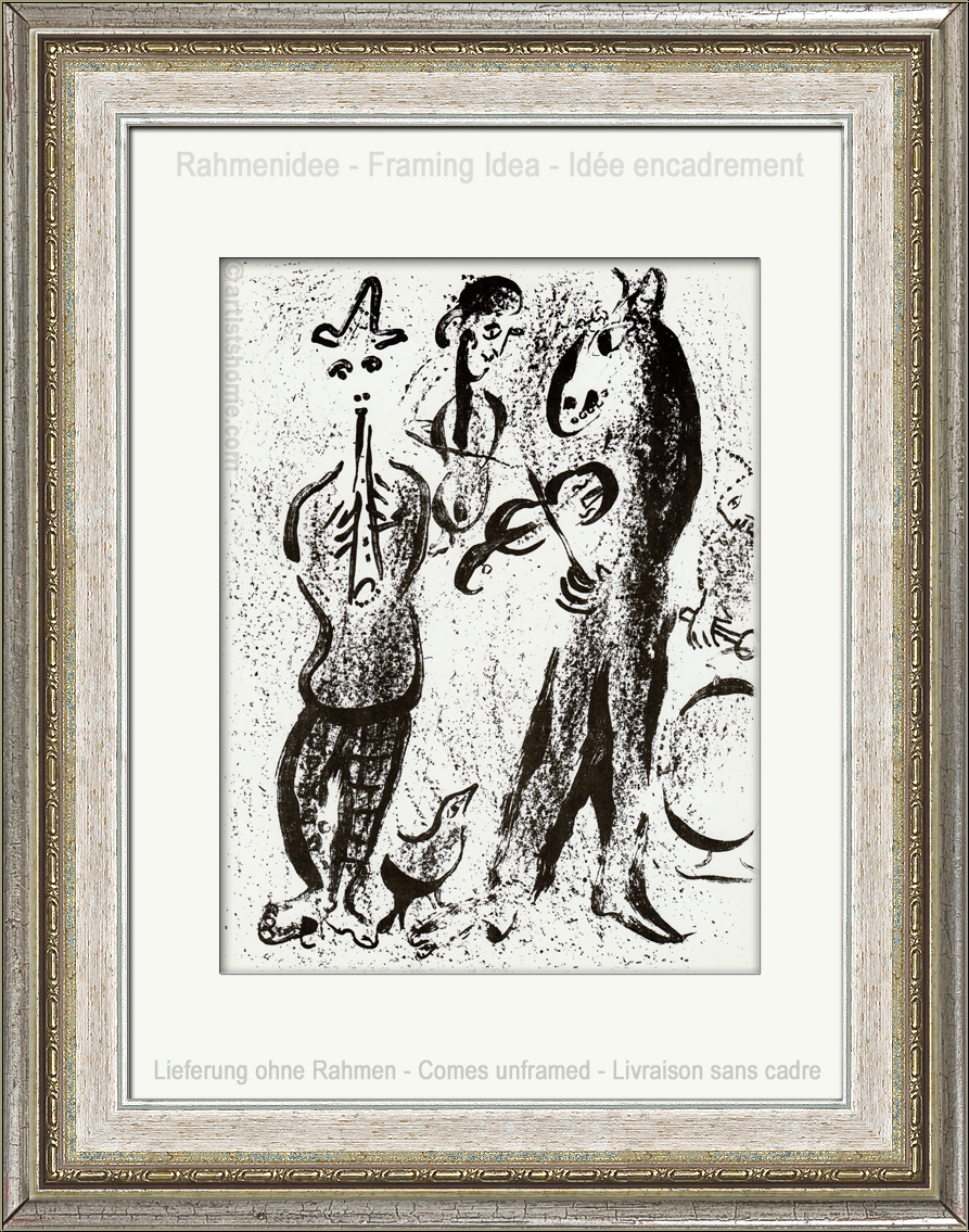 | | "Travelling artists" (Les Saltimbanques) Original lithograph by Marc Chagall featuring three adorable musicians playing different instruments such as violin and clarinet. | Technique: | Original lithograph "Les Saltimbanques" (Mourlot No 395) This is N O T a mass-produced photomechanical reprint but the original lithograph from the year 1963, exactly as referenced in Mourlots catalogue raisonné. | | Year: | 1963 | | Edition/Paper: | Offered here is one of the unsigned impressions for the limited book edition on smooth velin paper. In addition, 150 impressions on Arches wove paper with full margins were pulled and signed by the artist | | signed: | unsigned, as issued. | | Published by: | Éditions André Sauret, Monte-Carlo | | Printed by: | Mourlot, Paris | | Remarks: | Between 1960 and 1974 Marc Chagall created 28 full-page lithographs for the six authoritative volumes about his entire lithographic work. These original lithographs are not to be confused with photomechanically reproduced prints with the same motif. | Documentation/ References: | Mourlot, Fernand. Chagall Lithograph [III] 1962-1968, André Sauret, Monte Carlo, 1969, No. 395 Your print is being delivered with an abstract from the a.m. catalogue raisonné. In addition, you'll receive a proof of identity (without selling price in case this print is intended as a present). | | Condition: | Read more A well-preserved impression from the archives. Frame not included in delivery. | | | Customer Reviews: This item has not been rated, yet. Customer ratings may only be submitted by customers who have bought this item and are logged in. Your name will, of course, be displayed anonymized (e.g., "Tom H., United Kingdom").  *Applies to deliveries to Germany paid via PayPal. In case of payment by bank transfer, delivery will take 1-3 days longer from the day of your banker�s order. Delivery times for other countries and information for estimating the day of delivery can be found here |