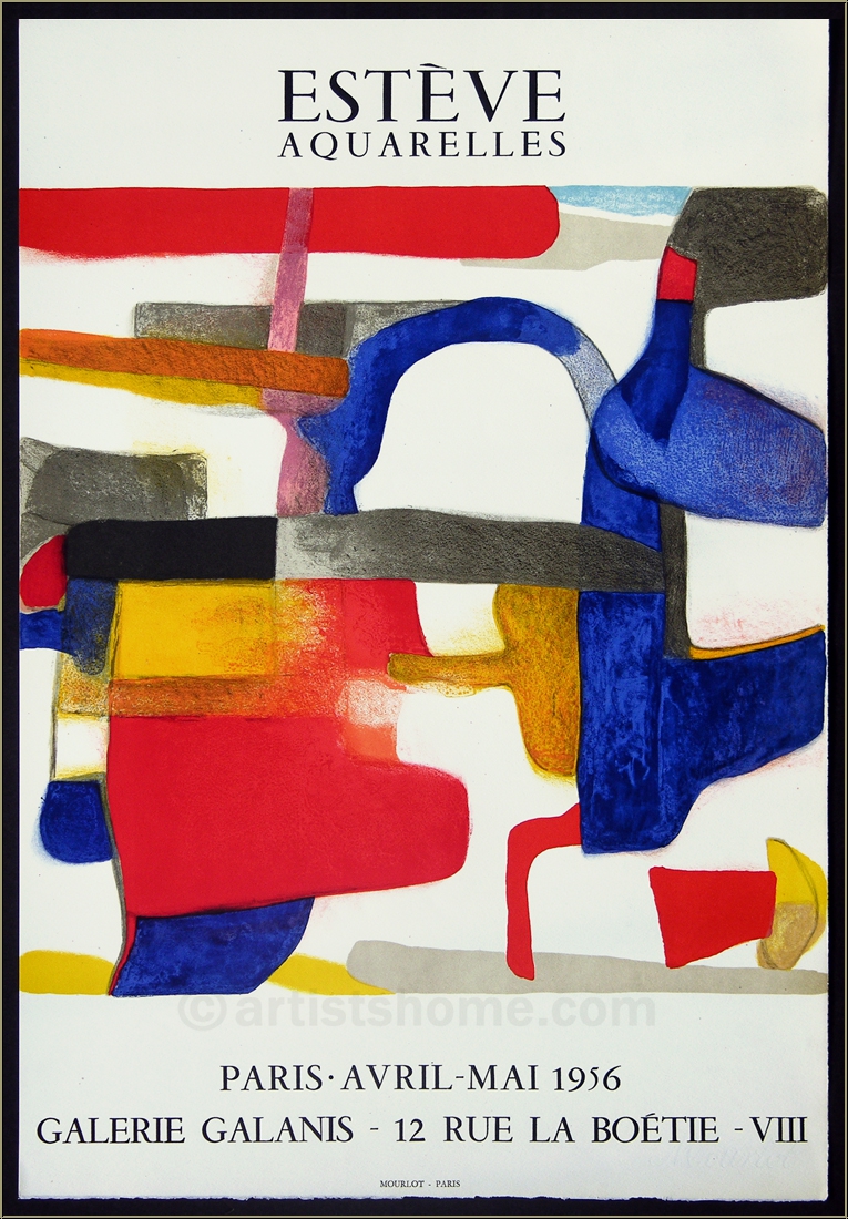Details:"La Cigale" - Estève Aquarelles, Galerie Galanis, 1956 Vintage poster with an original lithograph in colors, created by Estève to advertise his exhibition of watercolors at the Galanis Gallery in Paris. This is the second of only 10 posters in total, featuring original graphics by the artist.