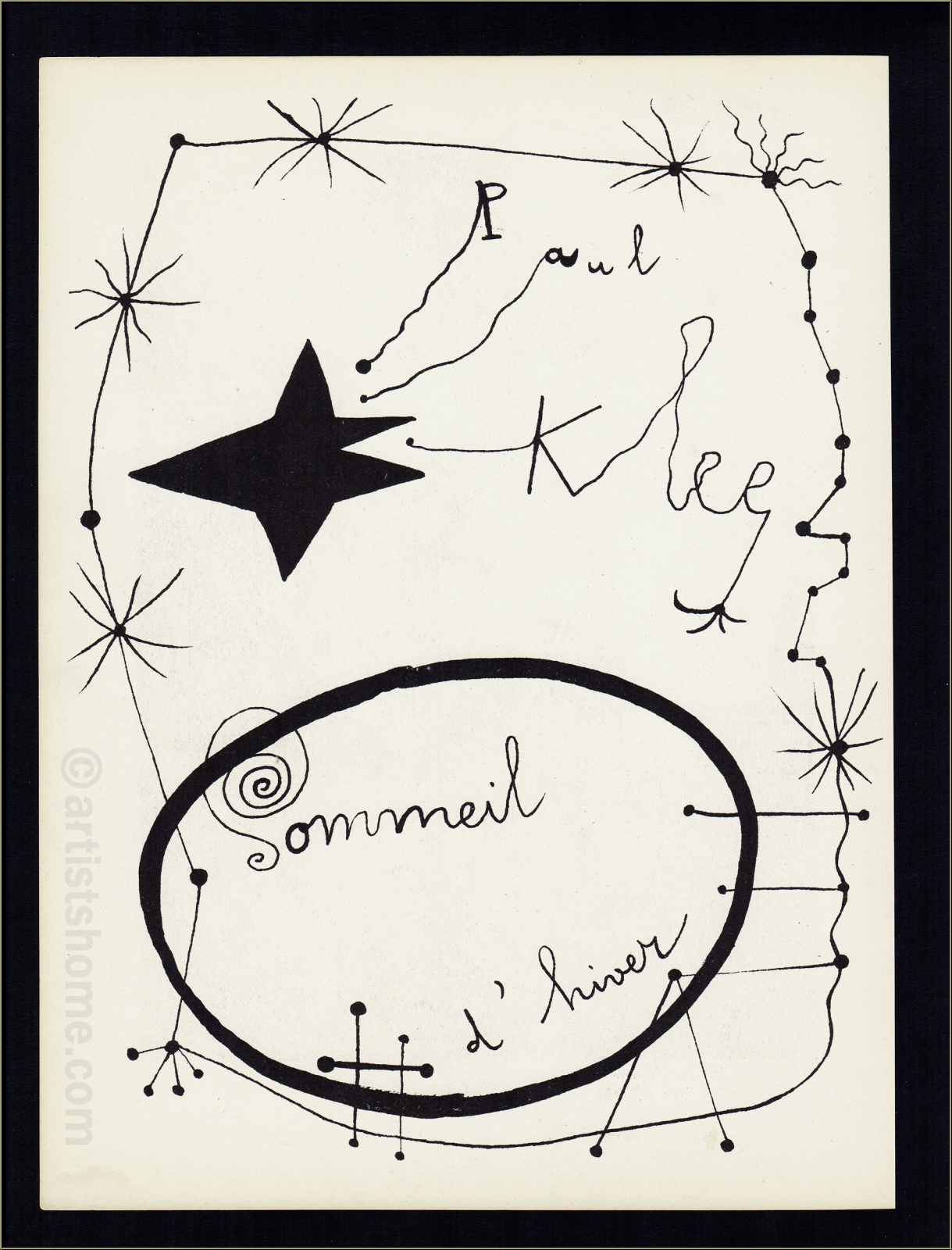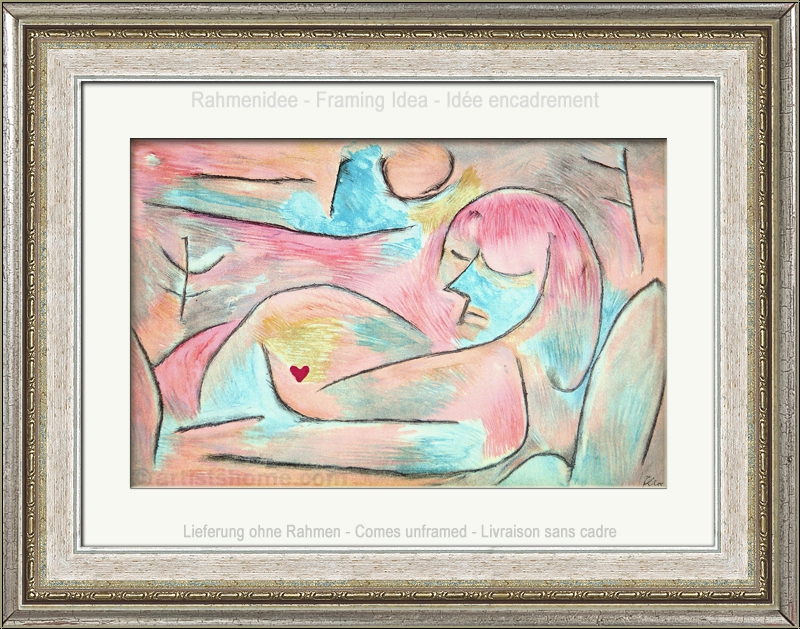 Details:"Sommeil d'hiver" (Hibernation) For this winterly work, Klee chose cool, but also warming pastel shades. For him, winter is obviously more than frost, coldness and frozen nature, and also a time of hidden becoming, of inner growing-up. There is a woman who seems to be sleeping, and her belly is curved. A small heart, drawn in a strong red, explains the curved belly. She is pregnant, a new life is growing inside her that she will, like a bear, give birth to in spring. This lithograph with the subject of "winter" was Paul Klee’s contribution to the art magazine Verve from 1938, published by Tériade, in which three other famous painters artistically represented the remaining seasons.