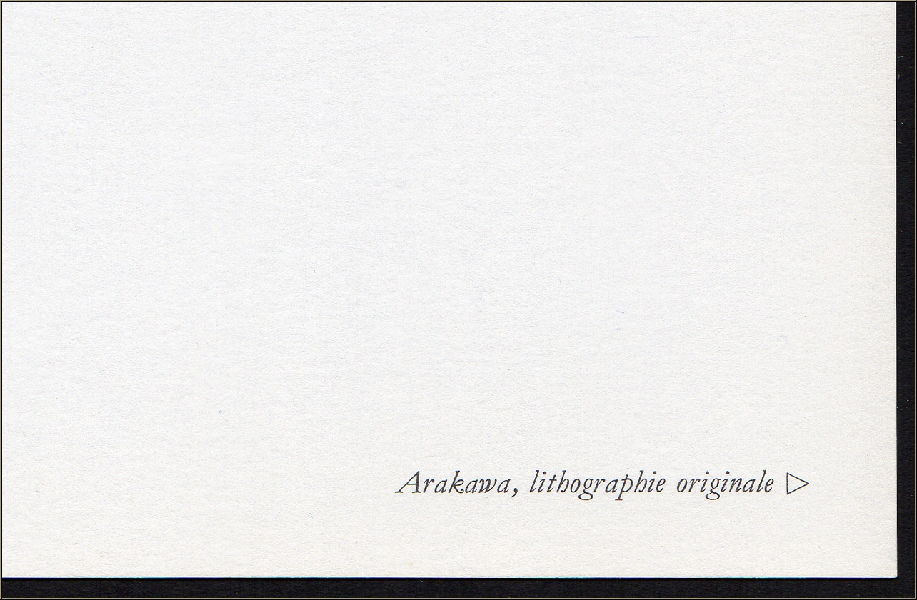 Text on the reverse (int.al.: "Arakawa, lithographie originale"), with the typical central fold and a few tiny holes from thread binding, as published.