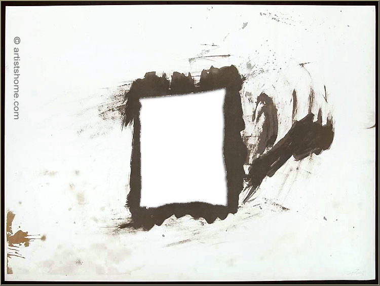 Early work in a small edition with the invitation to contribute: a rectangle with fringed edges has been punched out by Tàpies with the consequence that color and structure of the back panel chosen by its owner do directly interact with the artist's depiction (see photos).