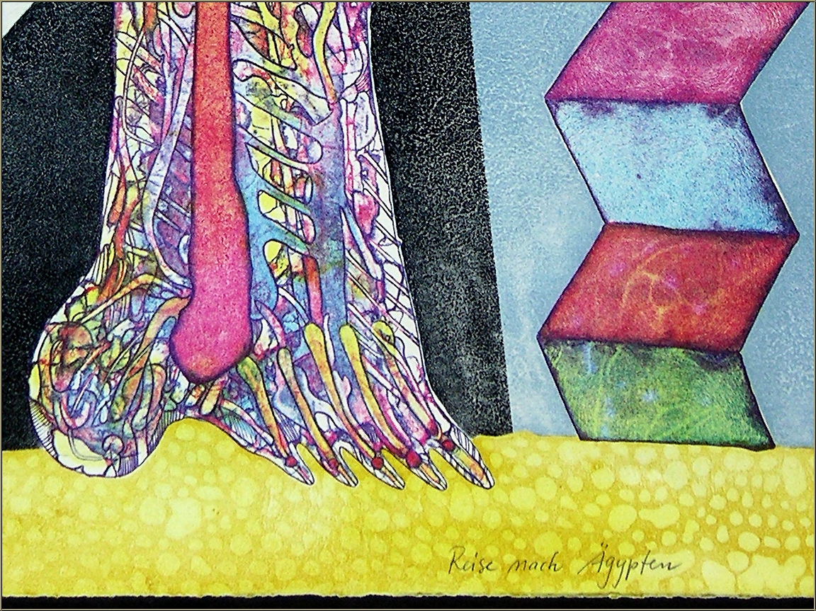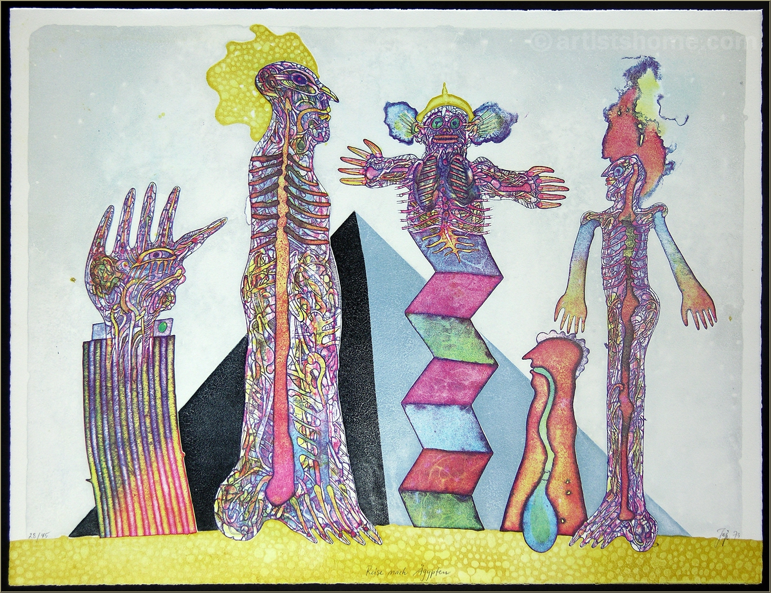 Details:"Reise nach Ägypten" (Trip to Egypt) - 1973 Typical work from Jaeger's "Human Zoo with all manor of creatures", who did not only cast off their clothes but also their skins - proudly presenting their insides to the viewer.
