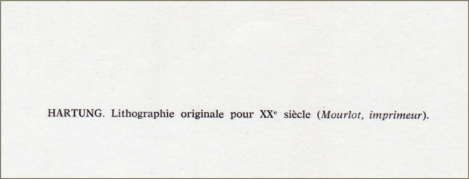 Text on the reverse: "Hartung. Lithographie originale pour XXè siècle (Mourlot, Imprimeur)."