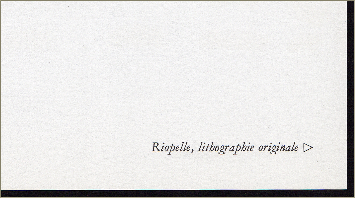 Text on the reverse, as published. The title "Riopelle, lithographie originale" is printed on the back of the previous page which will be supplied along with the lithograph.