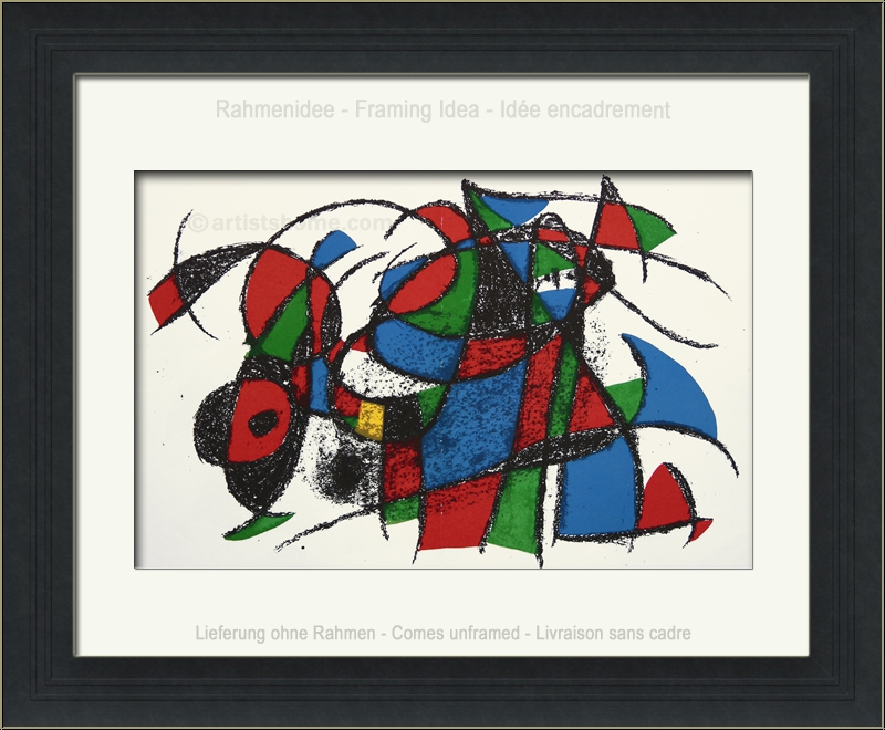 | | 'Original Lithograph III', untitled - Motif: Bee Miró also chose to leave this large-sized graphic without a title. Of course it was his proper right to leave some of his pictures untitled to inspire us to interpret his art for ourselves. The motif on offer here could possibly depict a honeybee at work. Technique/ Description: | Original lithograph in colors (Mourlot no. 1039), 1975 Text on the reverse: "Joan Miró Original lithograph III" (in different languages) This is N O T a mass-produced reprint (photomechanical reproduction such as photo lithographs or giclée prints) but the original lithograph from 1975, exactly as referenced in the applicable catalogue raisonné. | | Sizes: | ca. 32 x 49,5 cm / 12.5" x 19.5" (sheet) | | Edition / Paper: | One of the unsigned impressions for the book edition on strong velin paper. In addition, 150 unsigned impressions on Rives wove paper as well as 80 pencil-signed and numbered impressions on Arches wove paper with wide margins were published. | | Published by: | Different publishers (e.g. Maeght, Paris, for the French edition) | | Printed by: | Mourlot, Paris | | Remarks: | This is one of the big pieces in landscape format and thus has the obligatory centrefold and little holes from the thread-stitching, which may bother some people. On the other hand, both the centrefold and the holes from the thread-stitching are important characteristics to be able to tell that this is an original lithograph and not an art print (reprint). Besides, framed in a passe-partout mount, both can be hidden very well. | | Documentation / References: | Cramer, Patrick. Joan Miró. Lithographe V, Maeght Éditeur, Paris, 1992, Weber Geneve, pages 145 and 150, no. 1039 Your print is being delivered with a proof of identity (without selling price in case it is intended as a present). | | Condition: | Read more In very good, well-preserved condition. Frame not included in delivery | Customer Reviews: This item has not been rated, yet. Customer ratings may only be submitted by customers who have bought this item and are logged in. Your name will, of course, be displayed anonymized (e.g., "Tom H., United Kingdom").  *Applies to deliveries to Germany paid via PayPal. In case of payment by bank transfer, delivery will take 1-3 days longer from the day of your banker�s order. Delivery times for other countries and information for estimating the day of delivery can be found here |