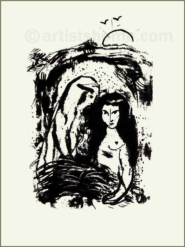 Details:"Ruth at the feet of Boaz" This is one of Chagall’s typical pieces of art, in which he gives voice to his almost coy perception of sexuality. By moonlight, Ruth lay down beside Boaz upon the suggestion of her mother-in-law Naomi. The two widows fear for their lives and therefore deem it appropriate to seduce the wealthy and good-hearted Boaz with their female charm – the end justifies the means (3:7 et seqq.). Chagall does not show us that Boaz will wake up around midnight and that Ruth will seduce him. Due to the Church’s hostile attitude towards sexuality up until recently, Chagall did not dare to be more direct in this respect. Only Ruth’s bare breast hints at the erotic situation. To enhance the painting’s colour composition, Chagall lavishly used all available shades of brown. Marc Chagall dedicated a sequence of five graphics to the chapter of Ruth. This one is the fourth and second to last piece on the woman who became Boaz’ wife and consequently King David’s primordial mother through love, faithfulness and consistency.