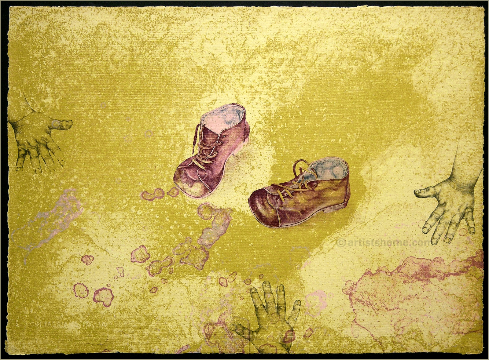 Reiner Schwarz: Signed lithograph 'Kinderspiel' 1974, pair of child's shoes on pastel yellow, unique work