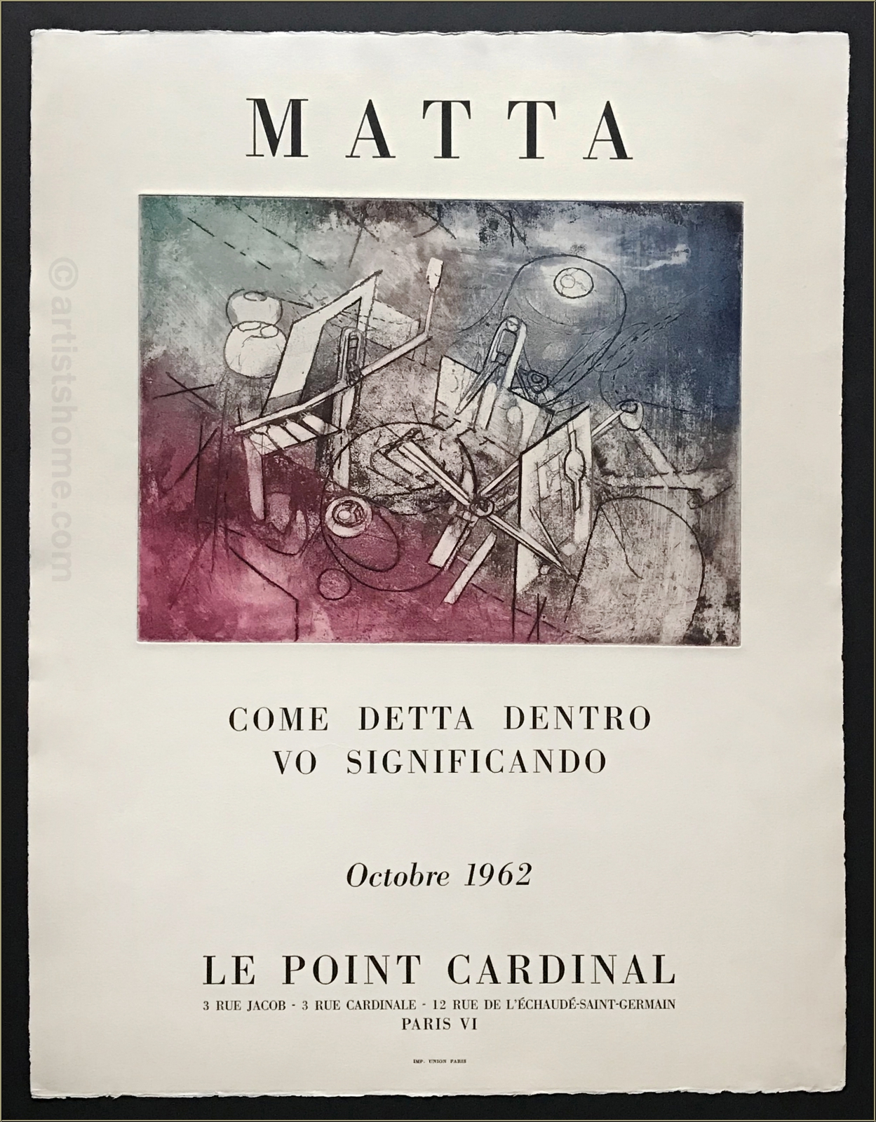 Original artists' poster from the year 1962, printed on Arches paper and featuring an elaborate etching in colors, created by Matta for the exhibition of "Come detta dentro vo significando" at the "Le Point Cardinal" Gallery in Paris.